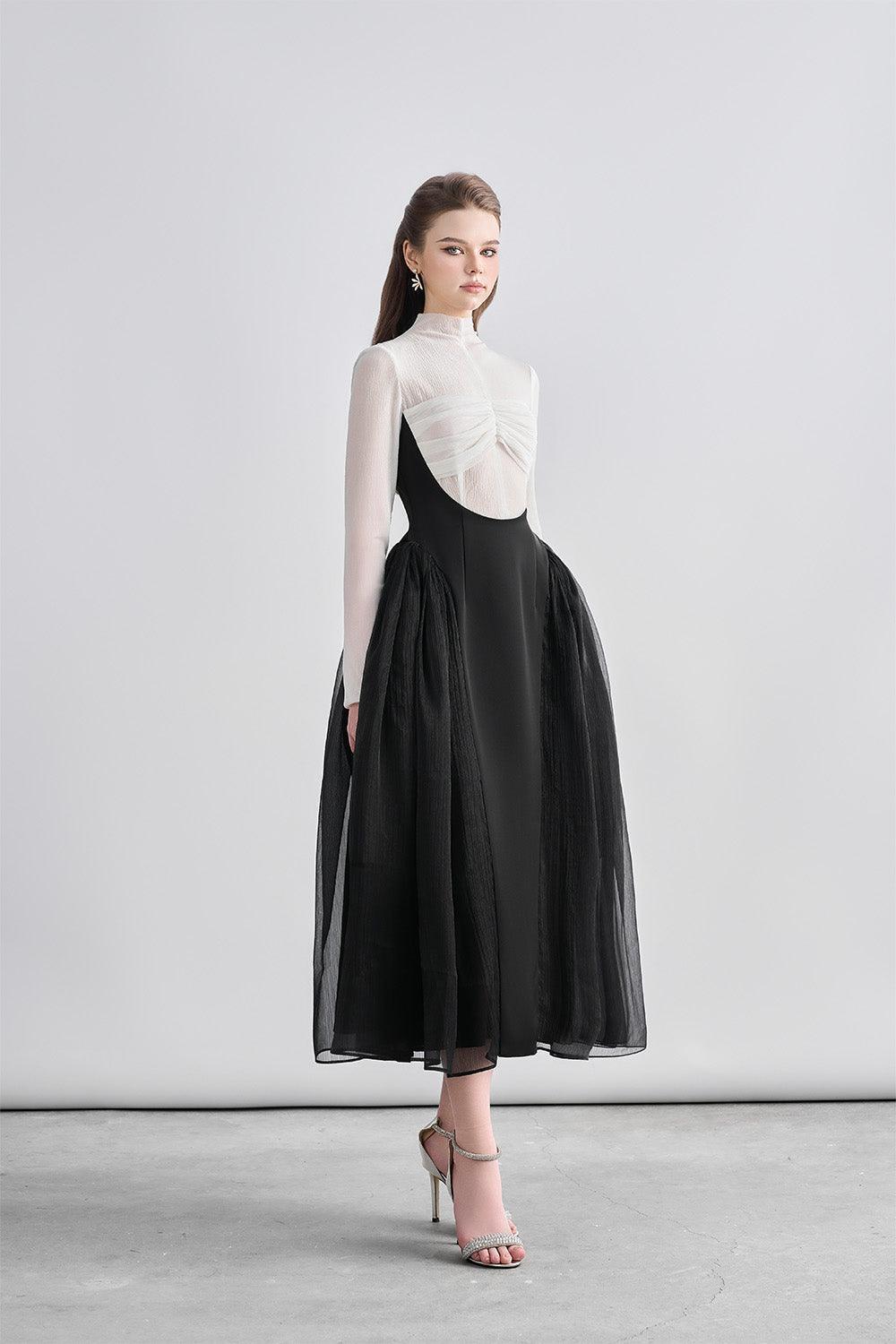 ميزات خاصة: صدرية مجعدة, مجمعة ومتسعة على الجانب, قصّة منحنية مع قماش فوال عند الخصر, لون ثنائي اللون
