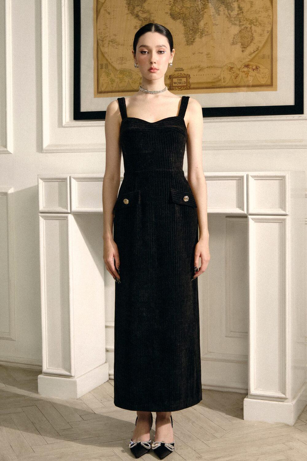 تصميم بسيط لفستان متوسط الطول مزين بتفاصيل جيوب صناعية مما يجعل التصميم أكثر عصرية ورائعة. تعمل خطوط رمي السهام الدقيقة على تعزيز صدرها بذكاء، بالإضافة إلى تصميم بأربطة وصورة ظلية غمد، كل ذلك يغري جسدها الساحر.