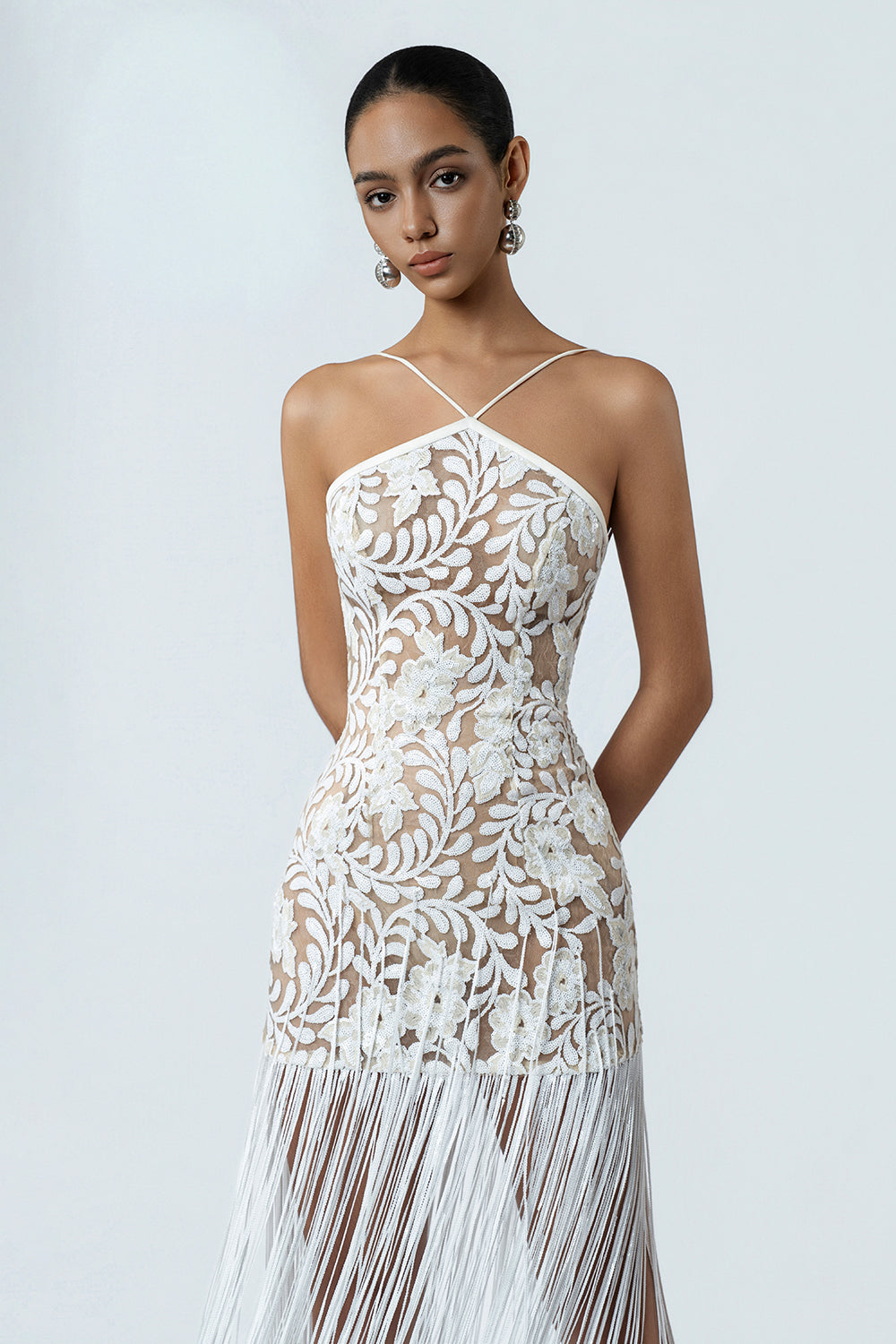 Expertly crafted from airy tulle, this sheath midi dress features a refined V-neck, intricate embroidery, and dramatic fringe embellishments. Ideal for cocktail parties, evening events, or sophisticated gatherings.