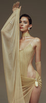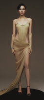 This expert-designed sheath maxi dress features a classic scoop neck and delicate bead embellishments. Crafted from premium organza, the draped and gathered sewing details create a sophisticated silhouette. Perfect for formal occasions, galas, or upscale evening events.