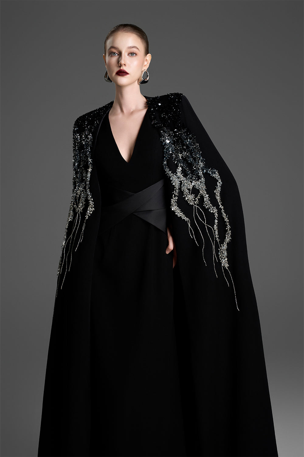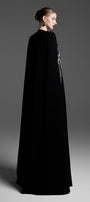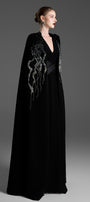 Elevate your wardrobe with this expert-crafted velvet maxi dress, featuring a flattering A-line silhouette, V-neck, and elegant cape sleeves. Embellished with hand-applied beads and sequins, it’s ideal for formal events, evening galas, or weddings.