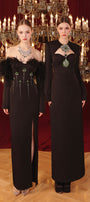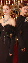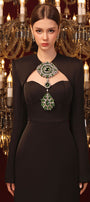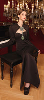 Cut-out at the front and back, Detachable rhinestone brooch, Slit back, Chest cup, Back zipper