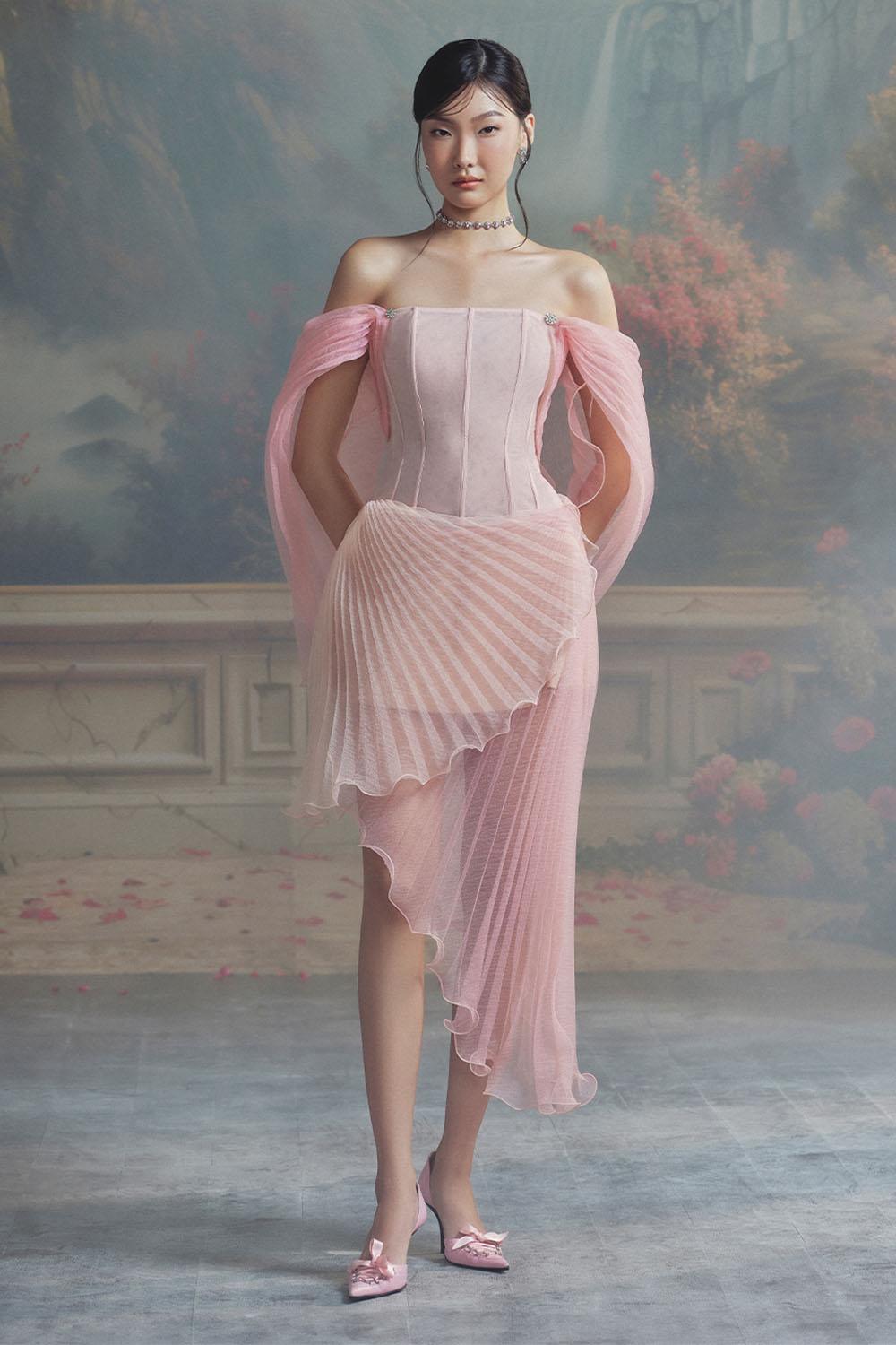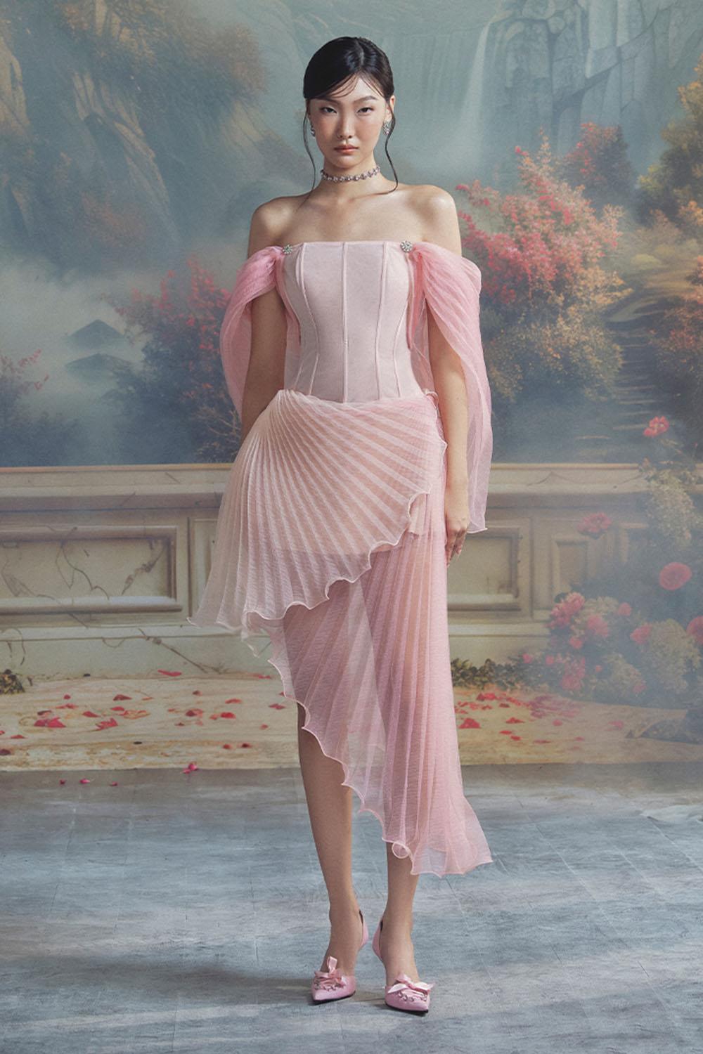 طبقات خارجية شفافة مطوية تخلق شكل صدفة بحرية, خصر مشد, كتف مرن على شكل عباءة, زر كريستال متصل على جانبي الصدر العلوي, حافة متموجة غير متماثلة