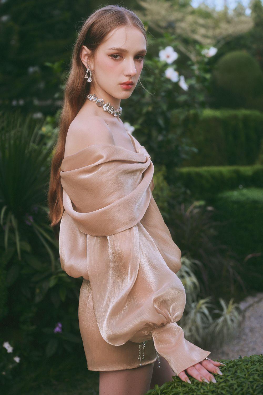 خط عنق ملتوي خارج الكتف, زينة بأحجار الراين على التنورة, مضغوط عند الورك