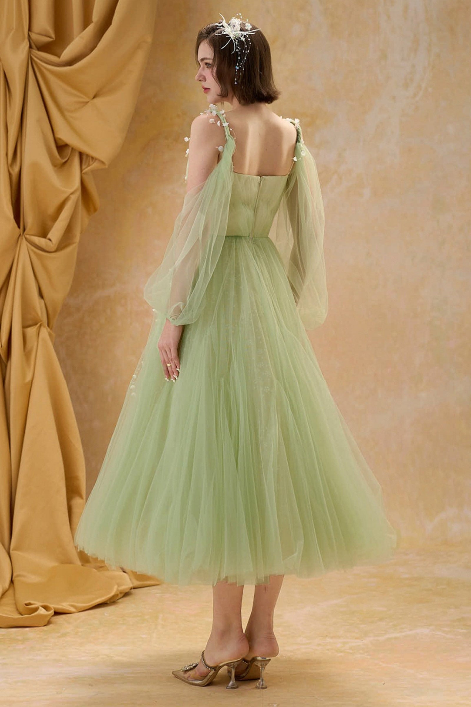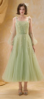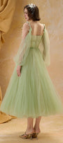 This expert-crafted midi dress features an A-line silhouette, square neck, and elegant puff sleeves. Intricate gathering, tulle fabric, and exquisite applique elevate its refined style. Perfect for weddings, cocktail parties, or upscale gatherings.