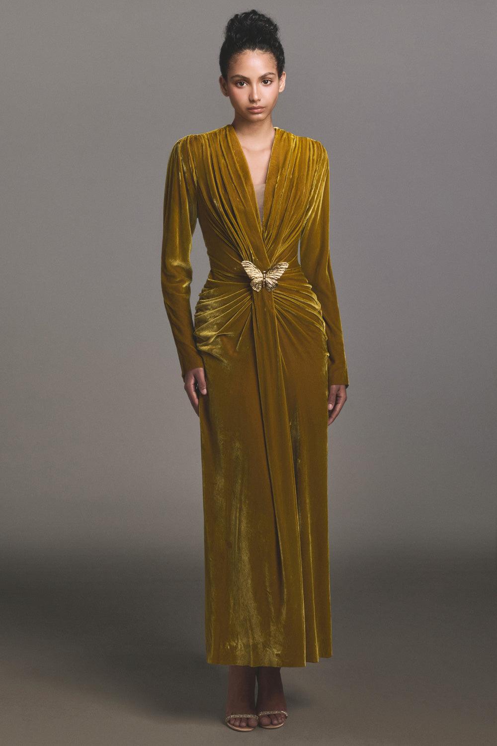 ينضح الفستان بالأناقة والرقي بتصميمه وقصته بطول الكاحل. هذا الفستان مصنوع من حرير الرايون الفاخر، وينسدل بشكل جميل على الجسم، مما يجعلك تشعرين وكأنه عمل فني. مثالي لأي مناسبة راقية، هذا الفستان هو قطعة مميزة تنضح بالحصرية والذوق الرفيع.