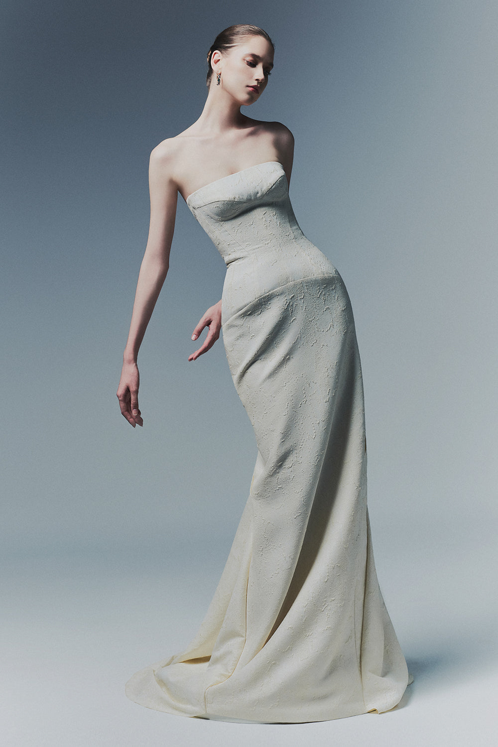Expertly crafted from luxurious brocade, this sheath maxi dress features a clean straight-across neckline for a modern touch. Ideal for formal gatherings, evening events, or upscale parties.