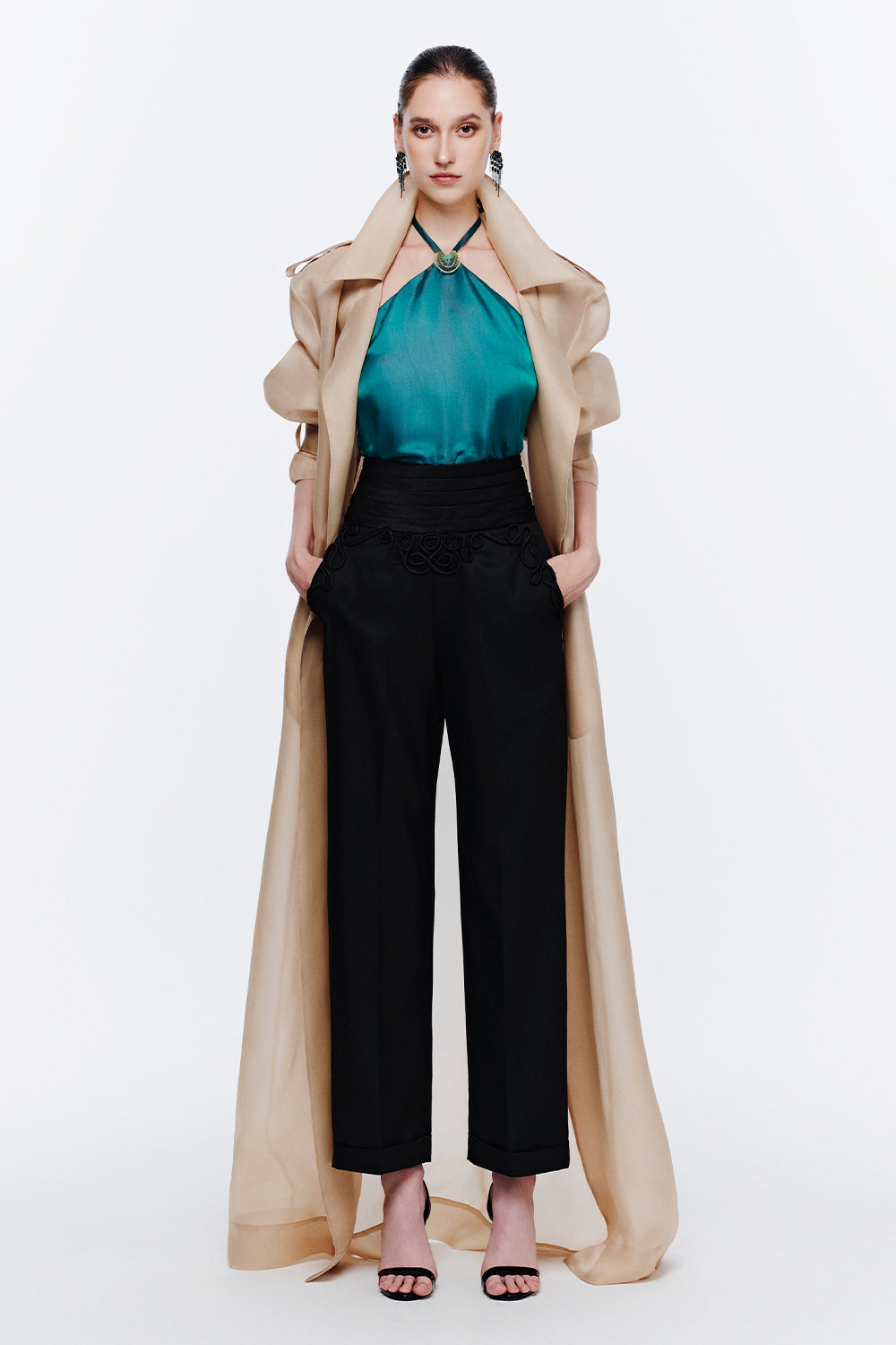 Elevate your wardrobe with this straight silhouette trench coat, crafted from airy organza and designed with a refined notch neck and regular sleeves. Ideal for business events, evening gatherings, or when you want to make an elegant statement.