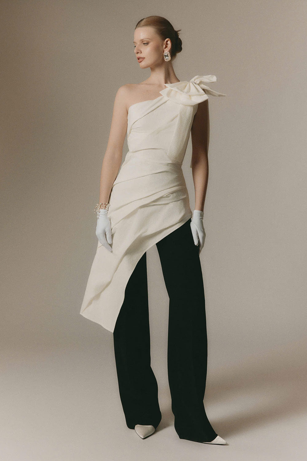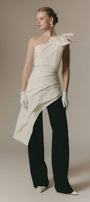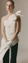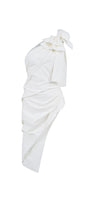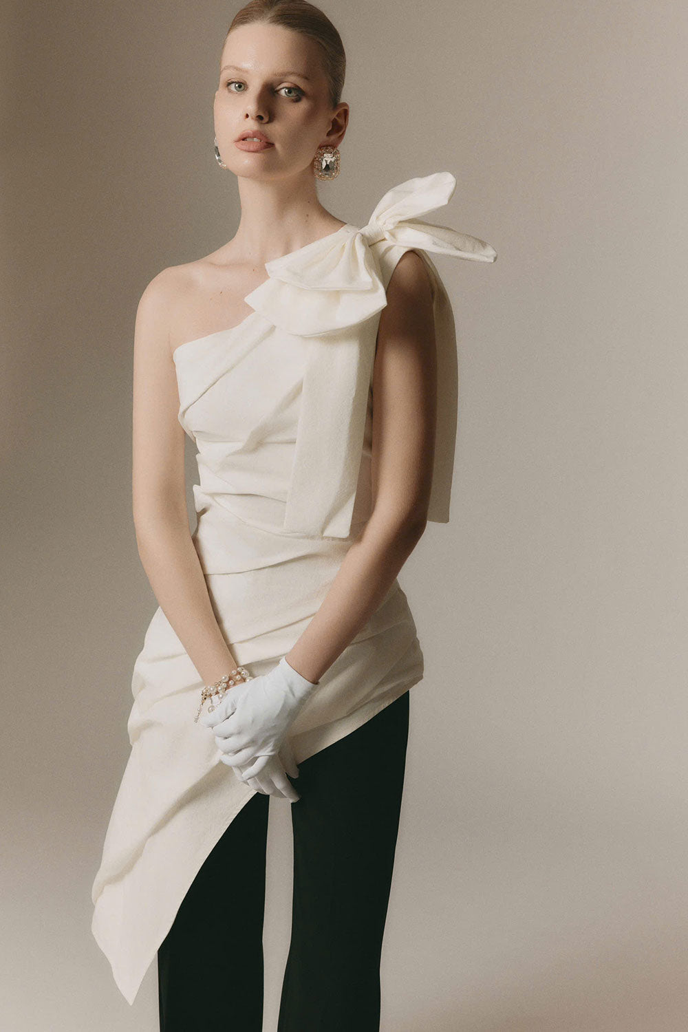 Asymmetric pleated , Big bow on the shoulder, Open shoulder