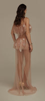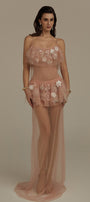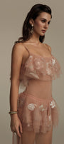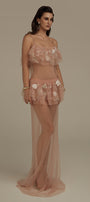 The dress presents a masterful balance of structural precision and ethereal movement. The streamlined straight silhouette provides a contemporary foundation, while strategically placed ruffle layers create dimensional texture and visual intrigue. Crafted from premium tulle, this maxi dress offers exceptional lightness with subtle volume that responds elegantly to movement. The layered construction demonstrates sophisticated pattern engineering, resulting in a garment that maintains its architectural integrity while delivering a refined, feminine aesthetic suitable for elevated occasions.
