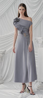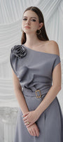 Faux fabric belt on the waist, Twisted flower on the chest, Gathered diagonal neckline