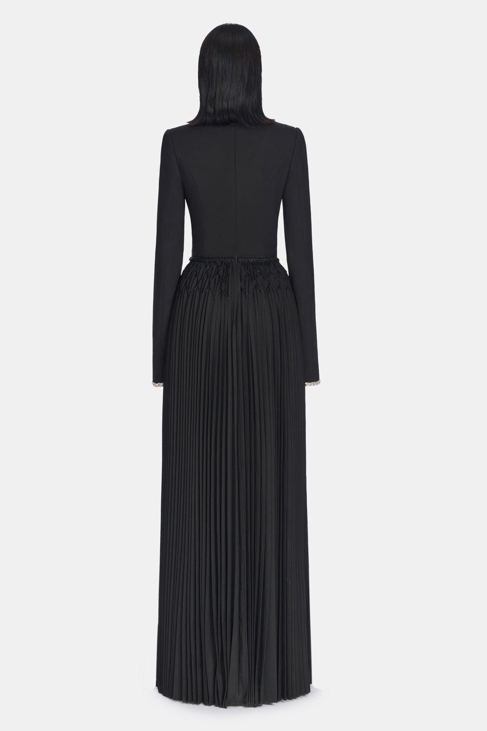 زخارف معينية مطرزة بالخرز, تنورة مطوية, رقبة عالية مرصعة بالأحجار, أطراف الأكمام بأحجار متصلة