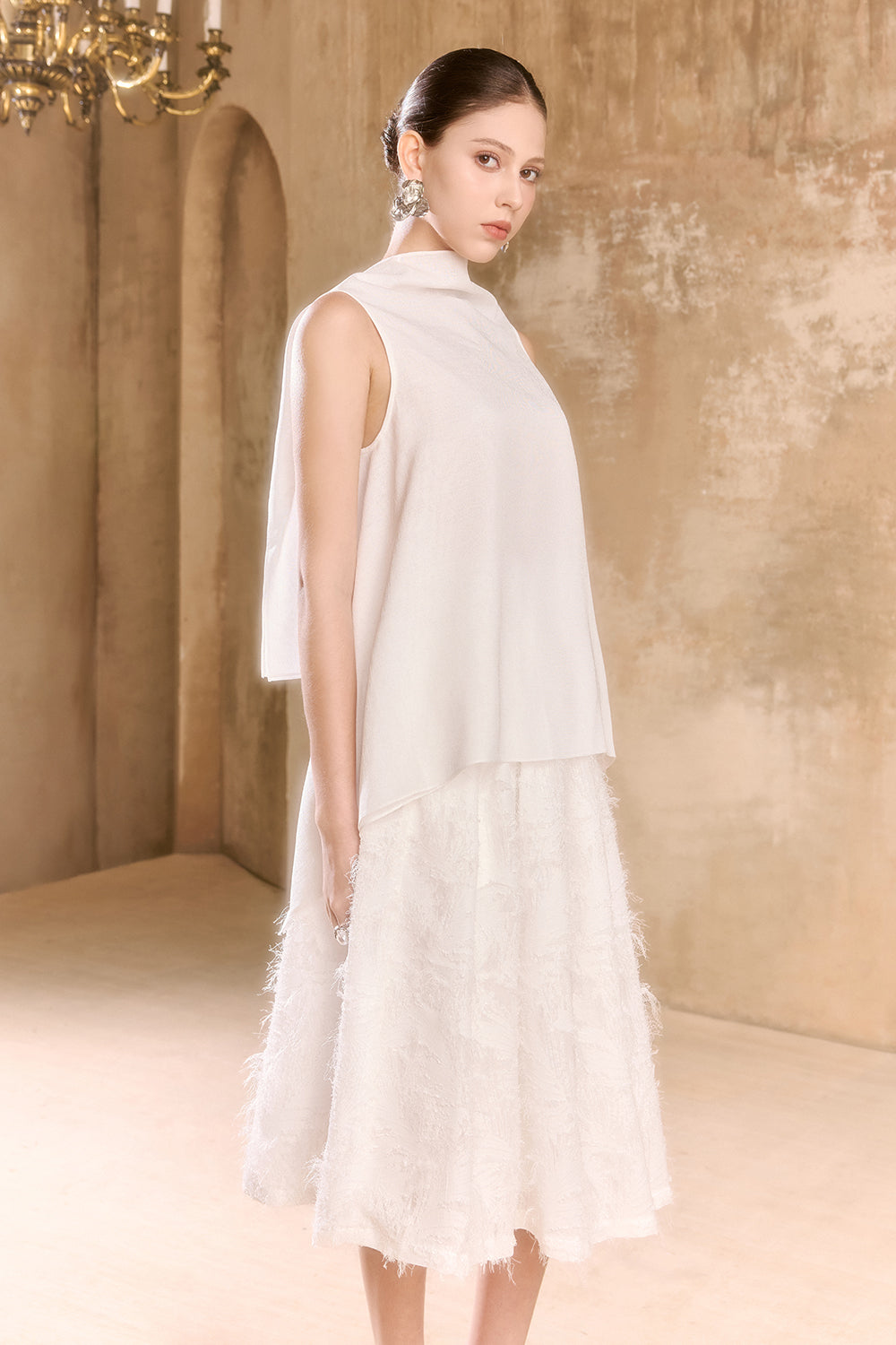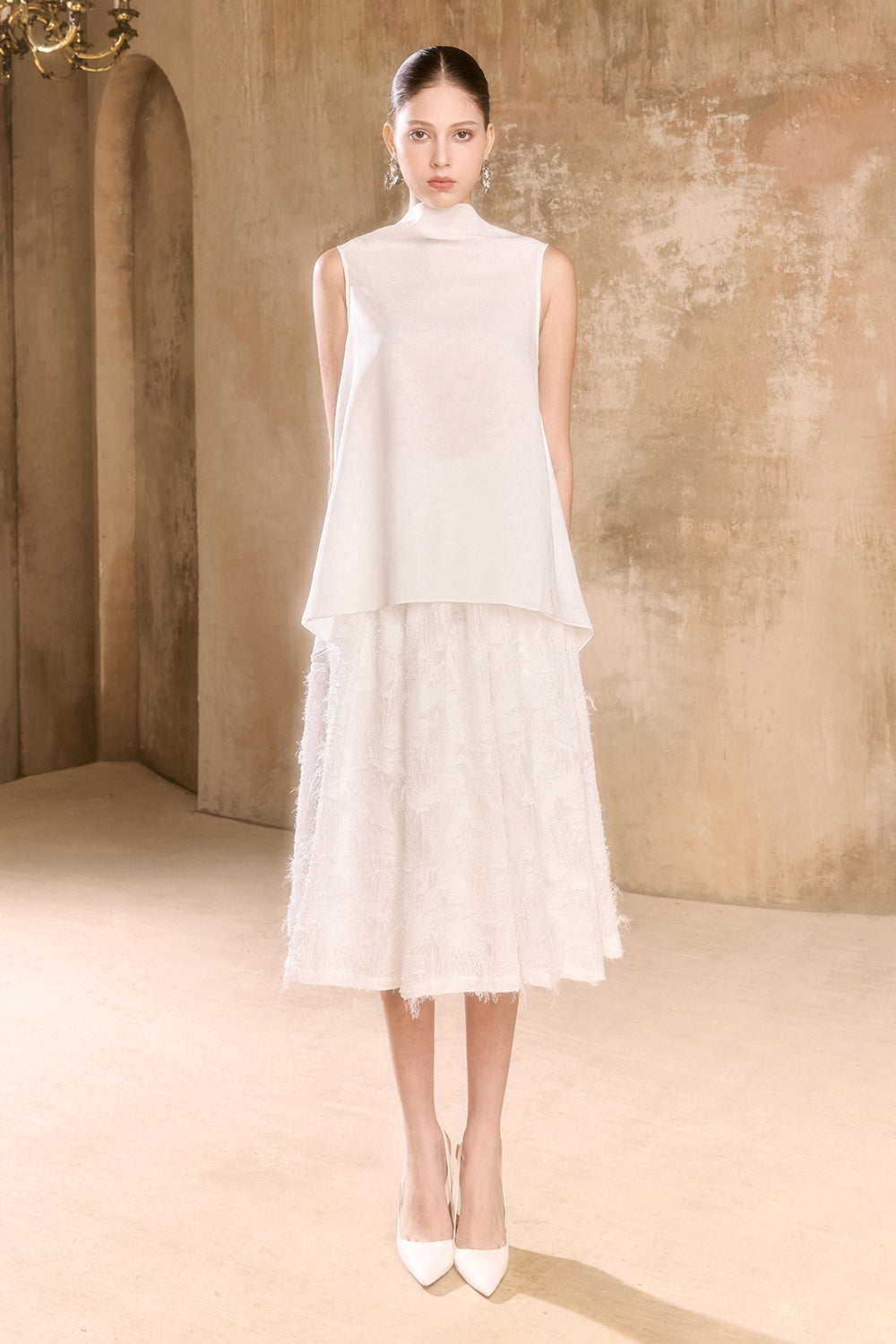 Expertly crafted, this trapezoid top features a sophisticated high neck for a modern silhouette. Its clean lines and refined shape provide effortless elegance ideal for both professional and social settings.