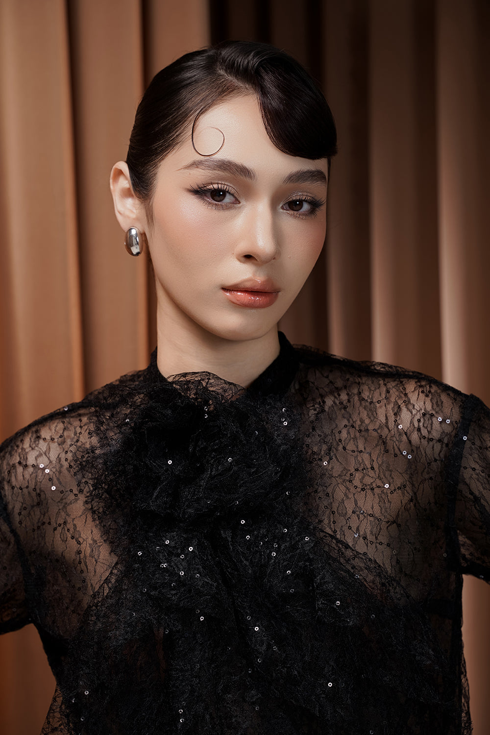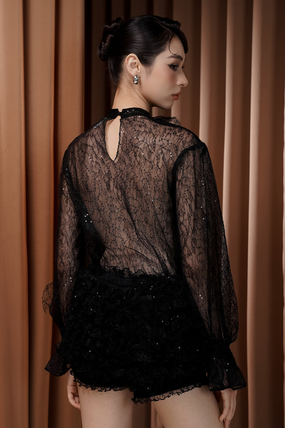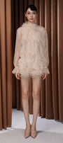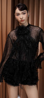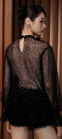 Elevate your wardrobe with this expert-designed babydoll top, featuring a sophisticated high neck, romantic poet sleeves, and elegant shirring. The ruffle embellishment adds feminine flair. Ideal for brunches, casual gatherings, or daytime events.