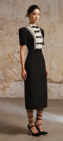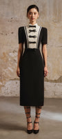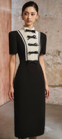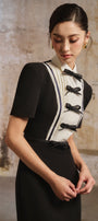 Bow sewn into the dress, Pleated bust, Two-color contrast