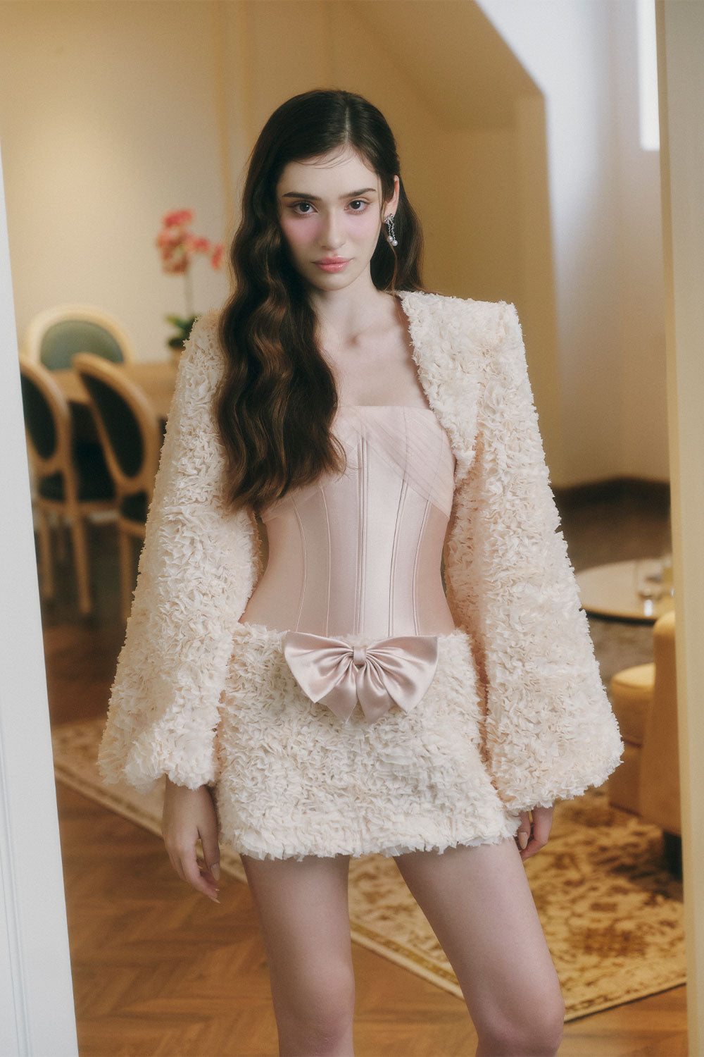 Attach a bow on the middle waistline, Dropped and fitted waist with corset, Corset waist