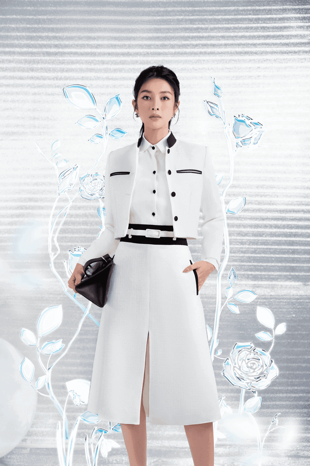 تنورة مستقيمة بخصر أسود مميز مع حزام أبيض تضفي الأناقة ومناسبة لبيئة المكتب أو حتى الحفلات الرسمية.