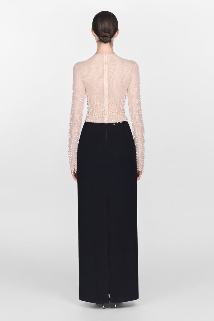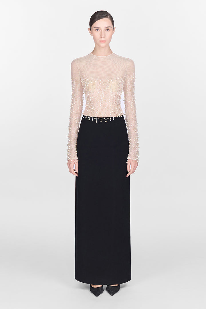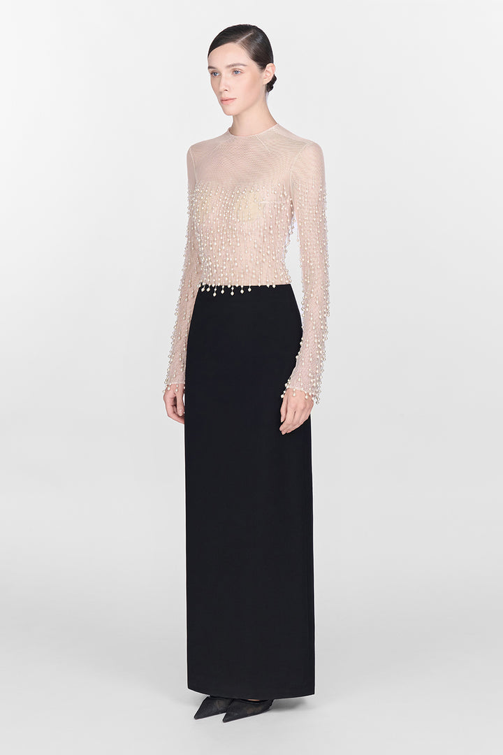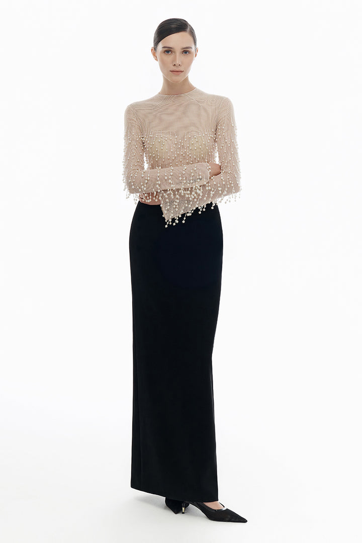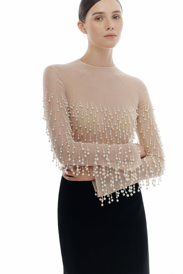This beige longsleeve top features a bodycon fit for a flattering silhouette. Made with faux pearls, it adds a touch of elegance to your look. Perfect for any occasion, this top combines style and comfort with its long sleeves. Elevate your wardrobe with this must-have piece.