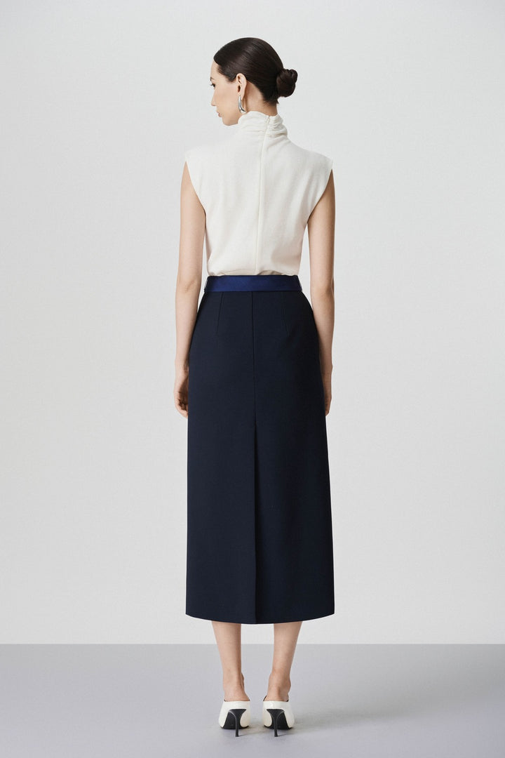 This Estelle Pencil Bow Tie Wool Midi Skirt features a stylish bow tie on the side and intricate beading on the body. Elevate your wardrobe with its elegant design and effortlessly chic silhouette. Perfect for any formal or professional setting, this skirt combines fashion and function for a timeless and sophisticated look.