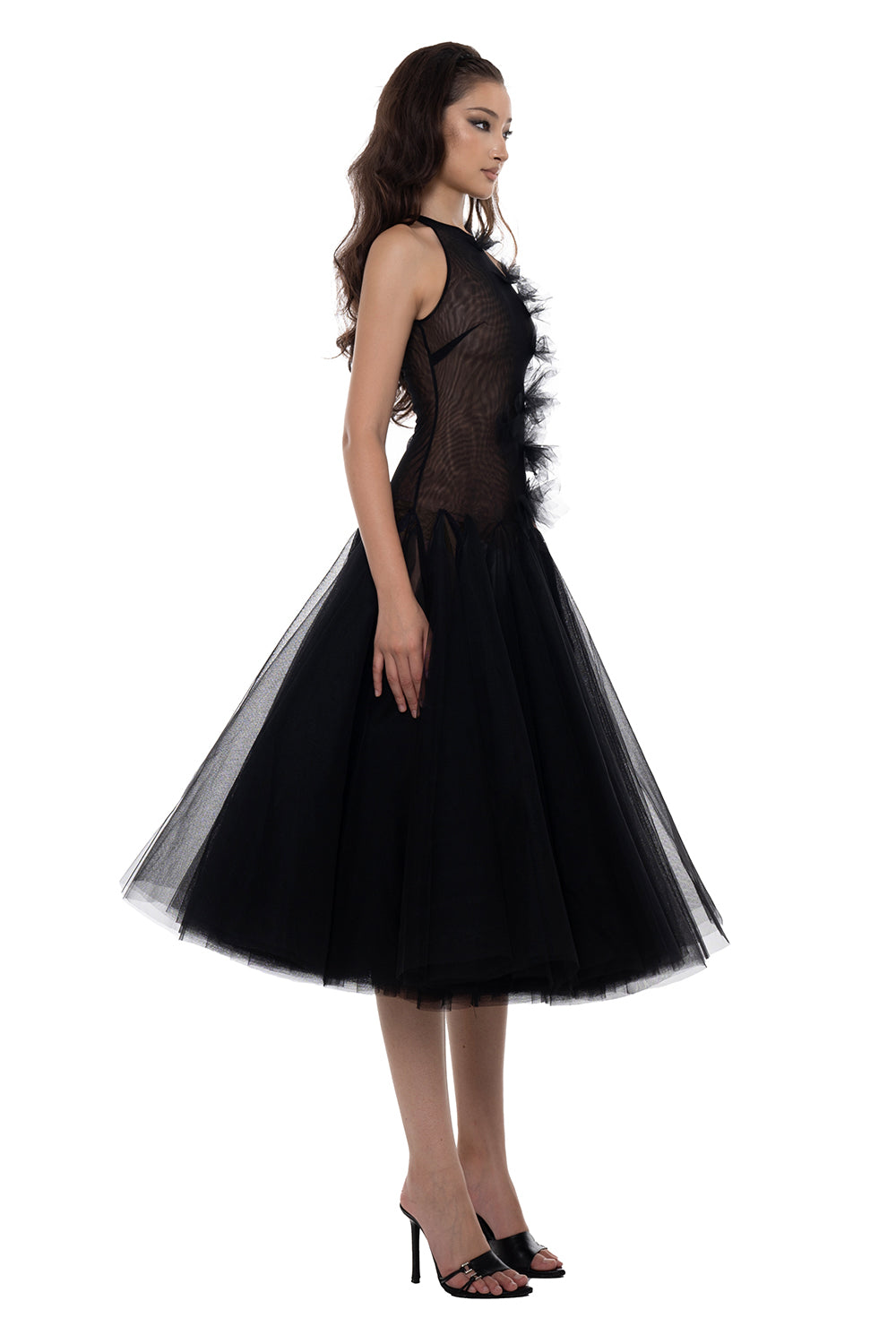 Elevate your wardrobe with this expert-designed A-line midi dress, featuring a sophisticated halter neckline, artful draping, and luxurious ruffle and feather embellishments. Perfect for cocktail parties, evening events, or any occasion requiring refined style.