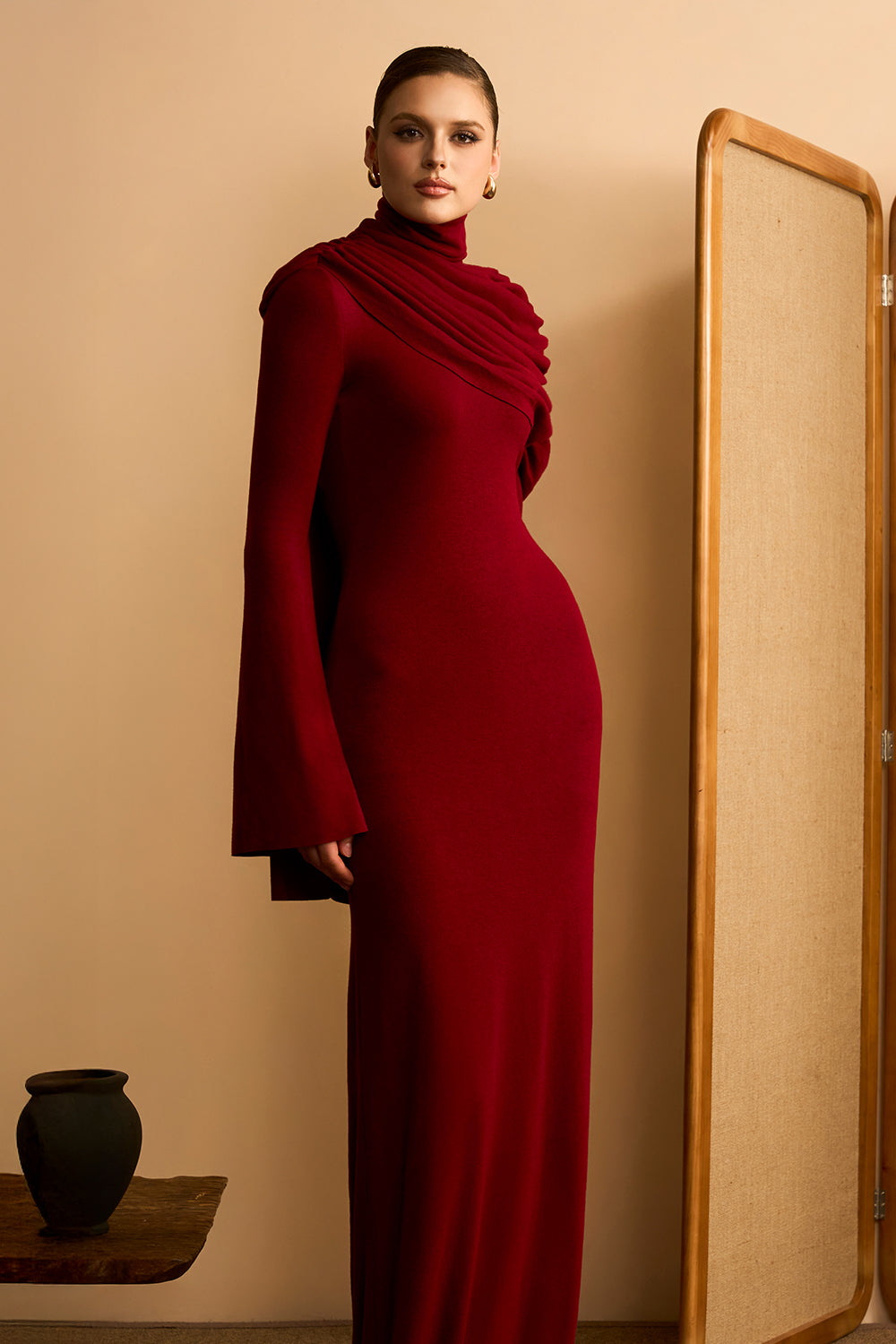This expertly crafted cocoon silhouette cape features a refined turtleneck with elegant draped and ruched detailing for a modern touch. Ideal for both elevated business events and sophisticated evening gatherings.