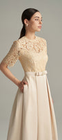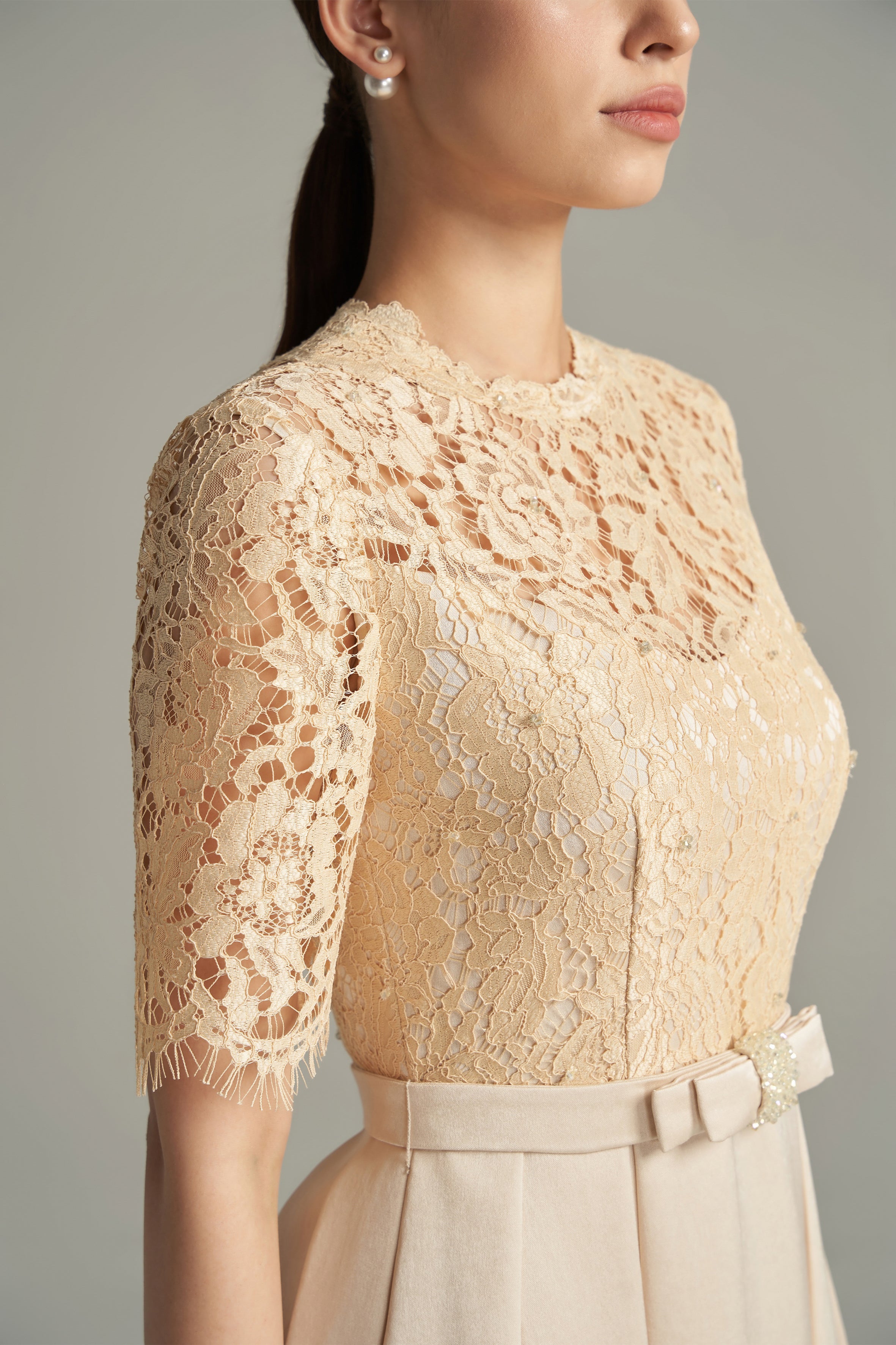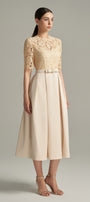 The dress combines timeless elegance with expert tailoring. Its flattering A-line silhouette gently skims the body, while the intricate lace overlay adds delicate texture and sophistication. The draped design enhances movement and visual interest, making it ideal for formal occasions or refined evening events. Crafted to a calf-length finish, this dress balances modesty with modern style, ensuring a polished, confident look.
