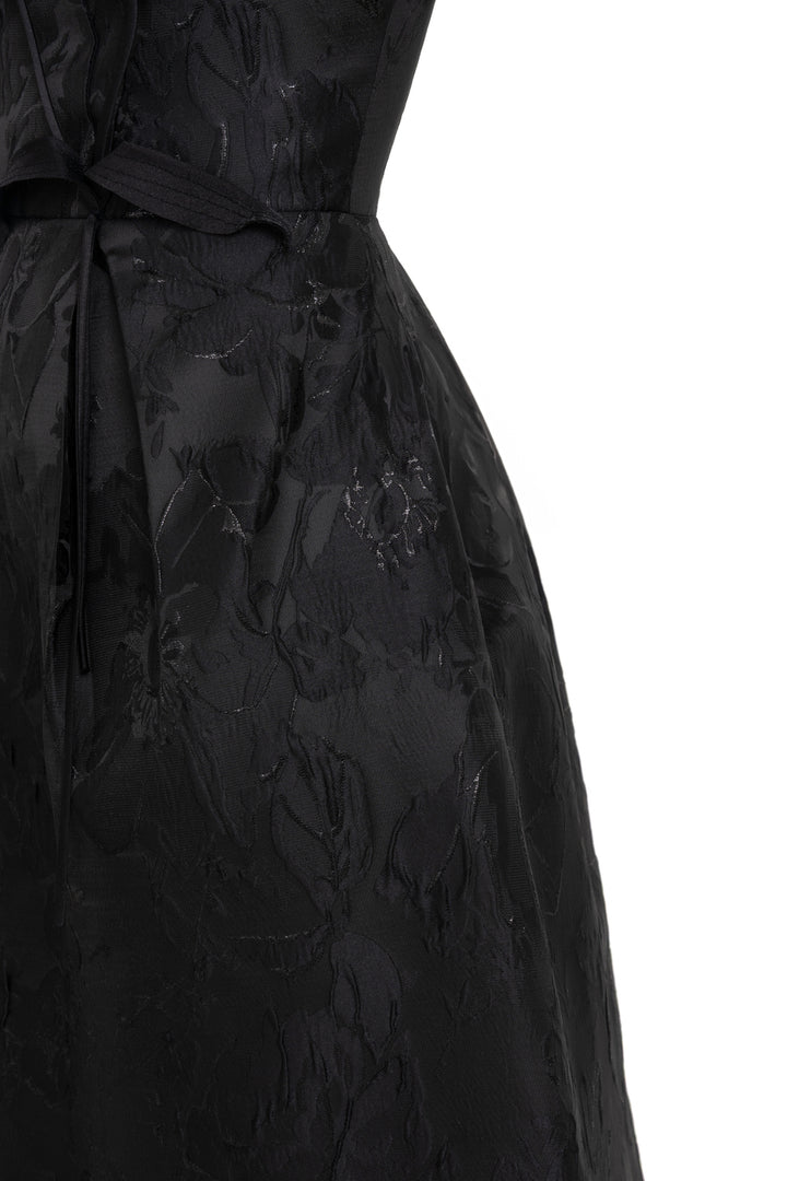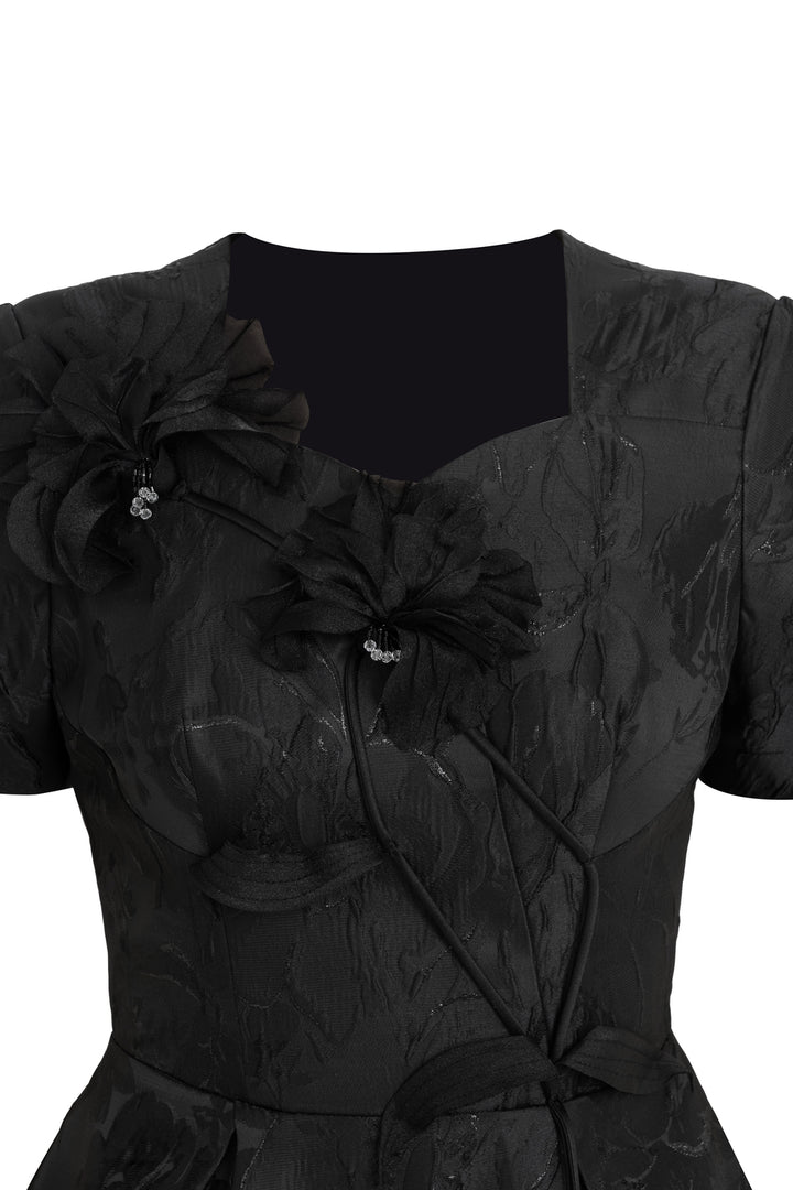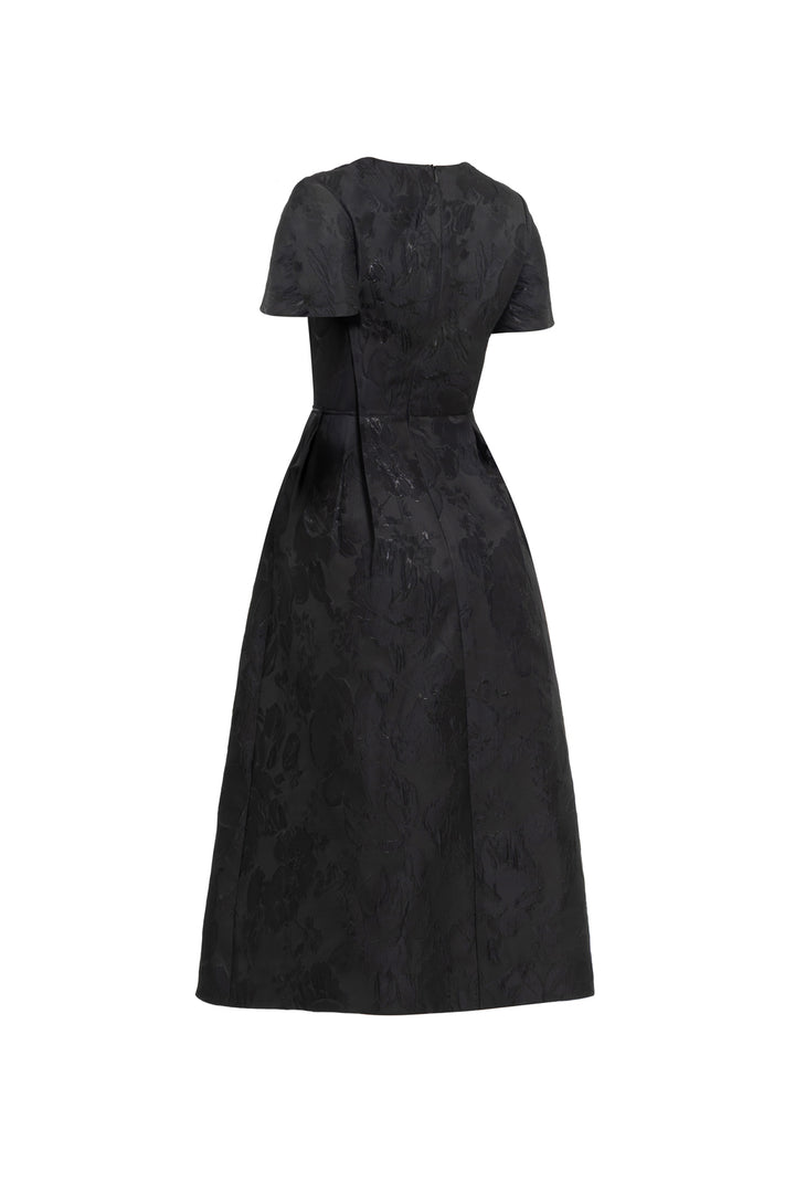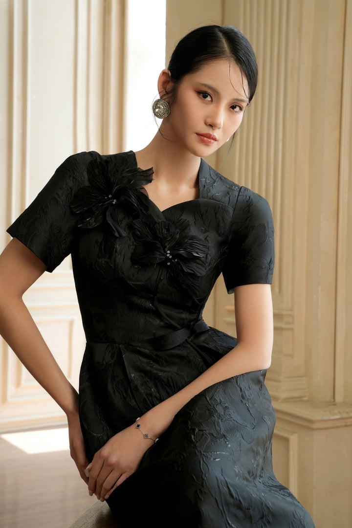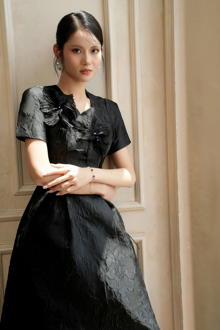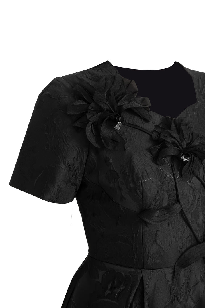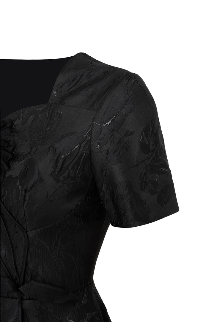 This midi dress features a sophisticated curved neckline and intricate jacquard fabric, enhanced by delicate flower applique embroidery on the chest. Its tailored silhouette offers a flattering fit, making it an elegant choice for refined occasions. The detailed craftsmanship highlights expert design and quality.
