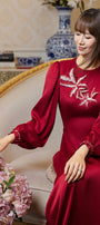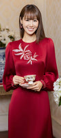 This Ao Dai features a sheath silhouette and bouffant sleeves, creating a sleek and elegant look. Made of high-quality silk, it provides luxurious comfort and a figure-flattering fit. Perfect for special occasions or formal events, this Ao Dai will make you stand out with its timeless beauty.