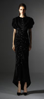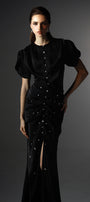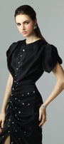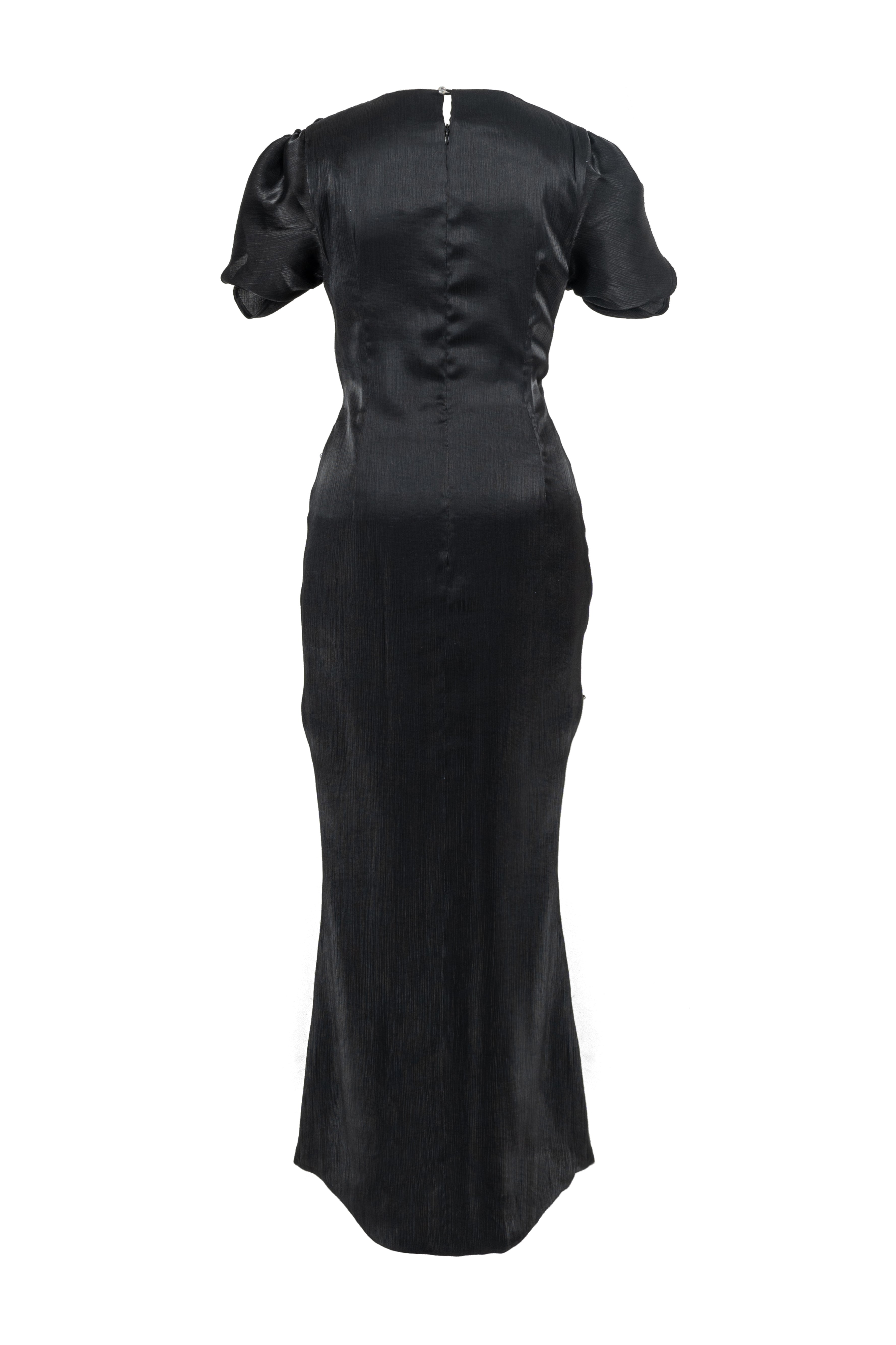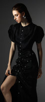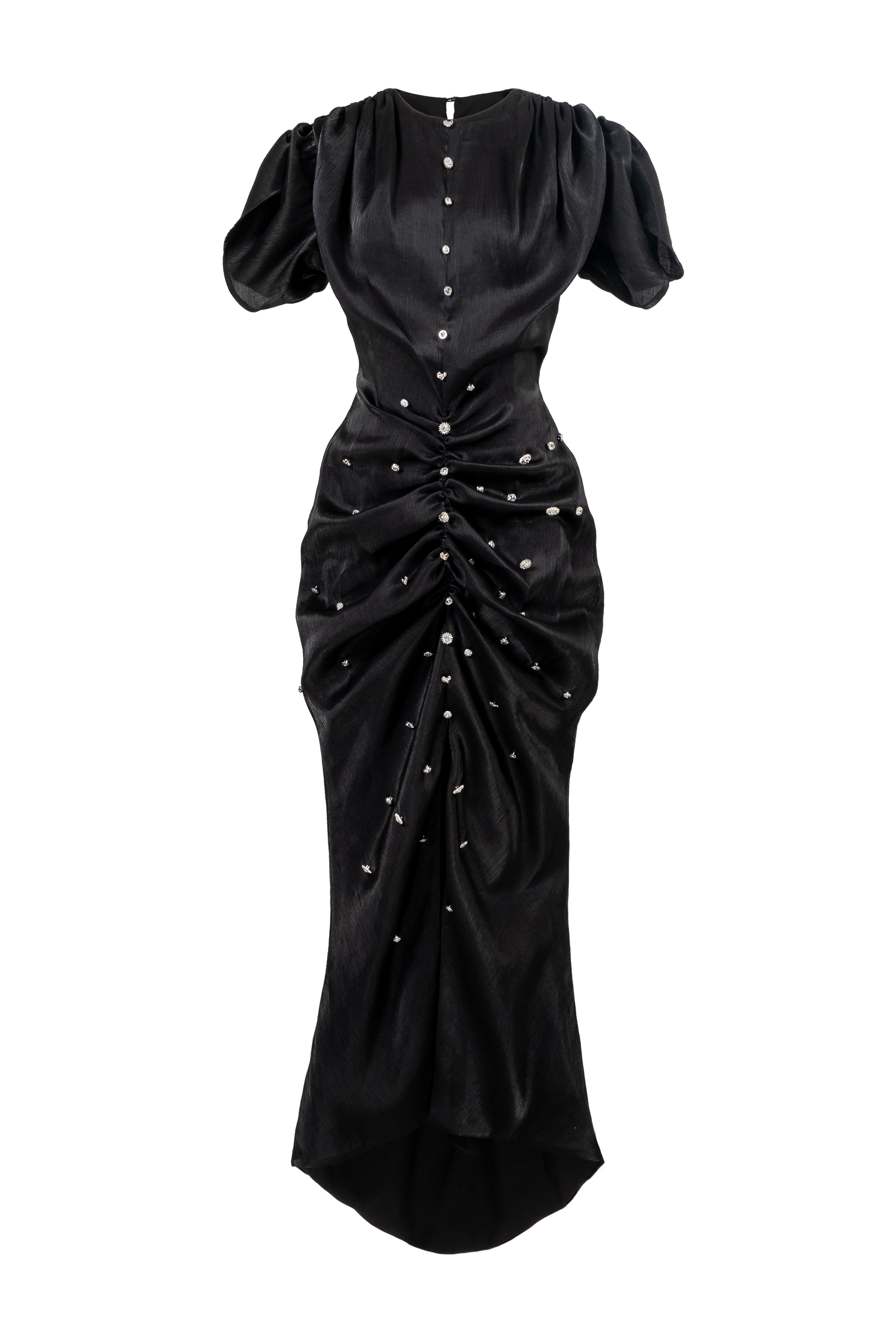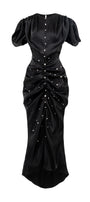 Elevate your wardrobe with this expert-crafted wrap maxi dress, featuring a classic round neck, elegant puff sleeves, and exquisite ruched details. Rhinestone and button embellishments add a touch of glamour. Ideal for weddings, evening events, or sophisticated gatherings.