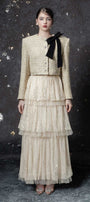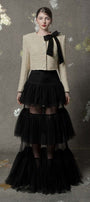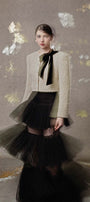 Cropped length with structured shoulders, Stone buttons on the front, Black bow on the neckline, Hidden snap-fastener