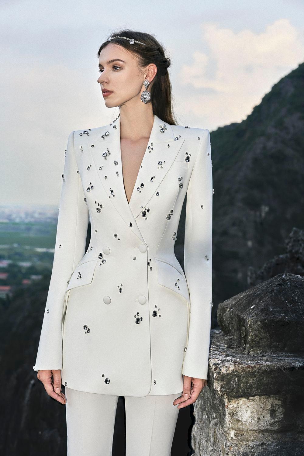 Padded shoulder, Peak lapel, Attached tear-drop beads, Double-breasted, Puffy hip with padded