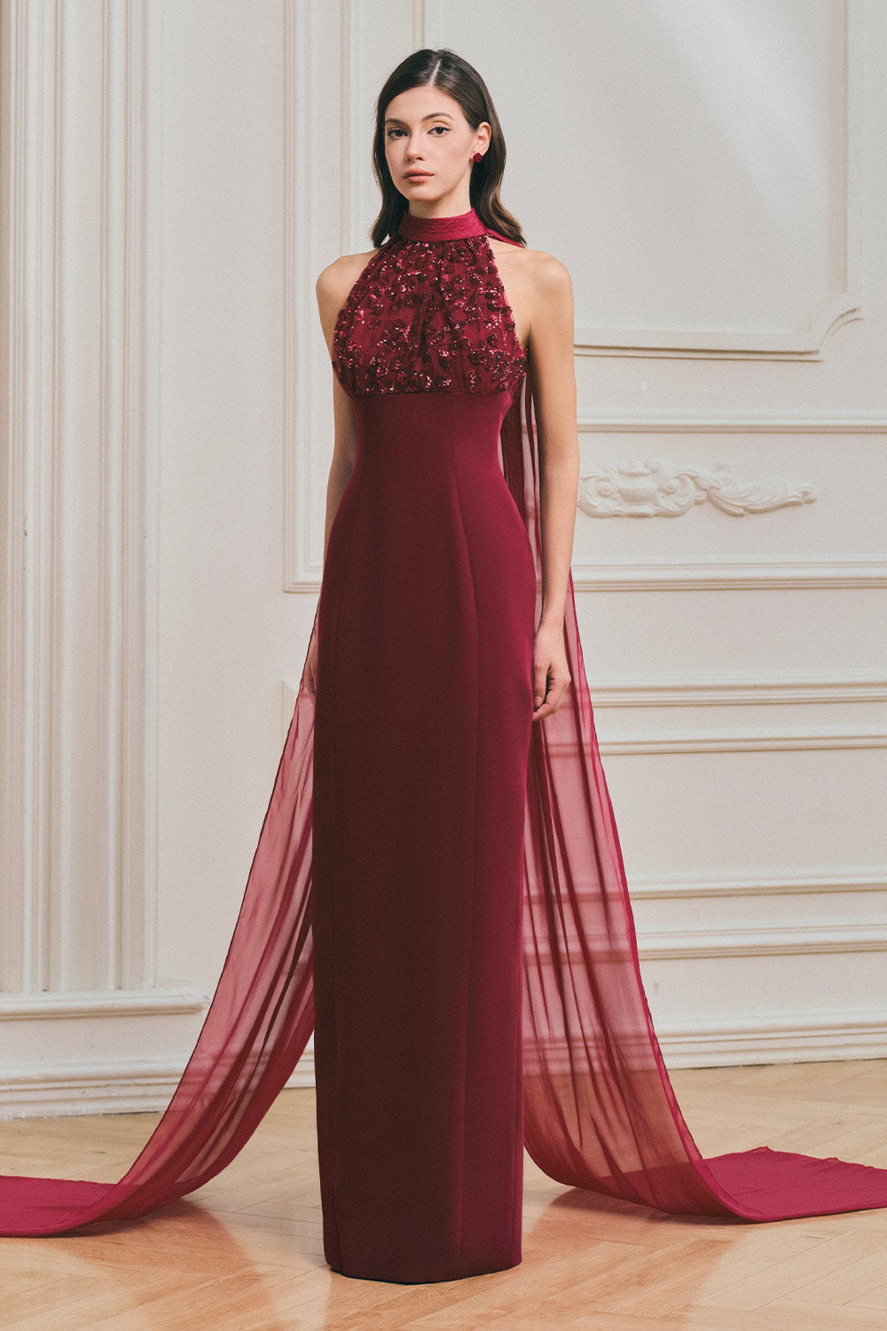 Burgendy Sheath Symmetric Flap Crepe Maxi Dress