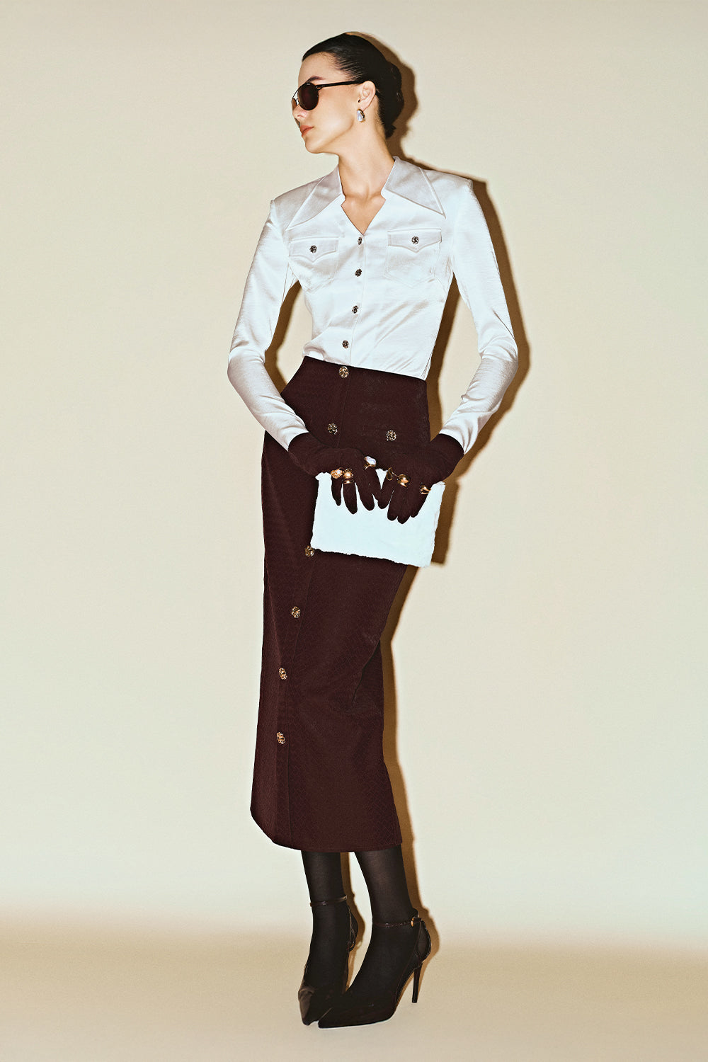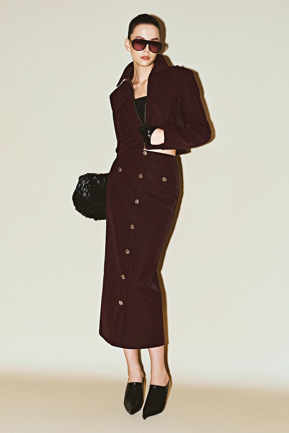 Expertly tailored, this straight skirt in premium PU features elegant button embellishments for a modern finish. Its versatile design elevates professional wardrobes and transitions effortlessly from office meetings to evening events.