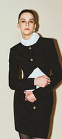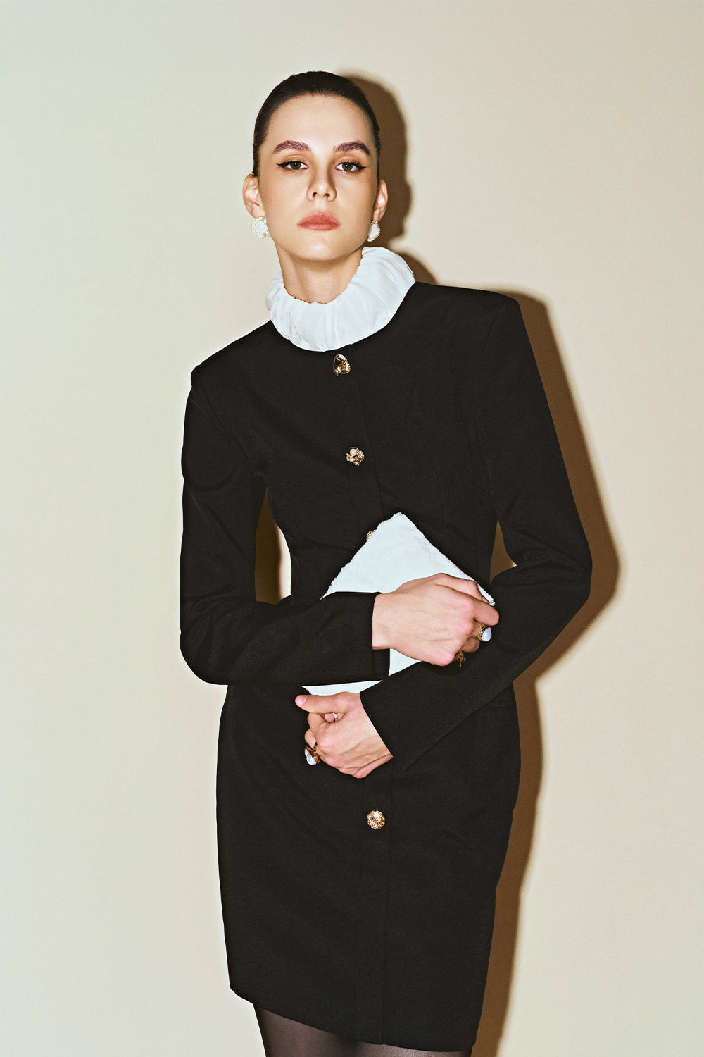 Expertly tailored for modern elegance, this cotton sheath mini dress features a sophisticated high neck, regular sleeves, and chic button embellishments. Ideal for cocktail parties, semi-formal events, or an elevated daytime look.
