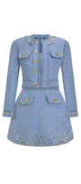 Elevate your wardrobe with this expertly tailored tweed set, featuring a classic A-line silhouette, round neck, and regular sleeves. Embellished with refined buttons and beads, it offers timeless elegance and comfort. Perfect for professional events, formal gatherings, or chic daytime occasions.
