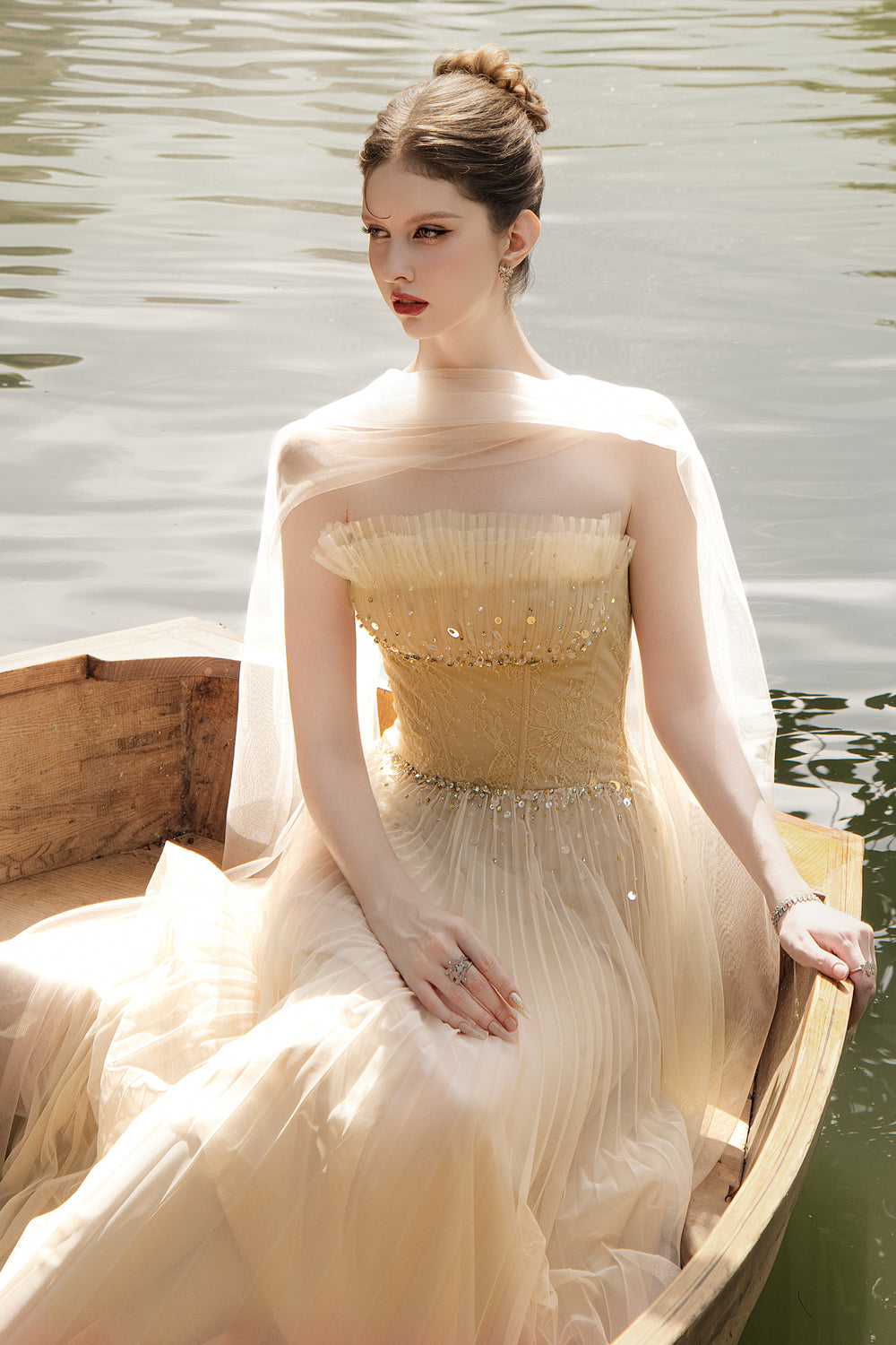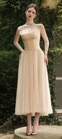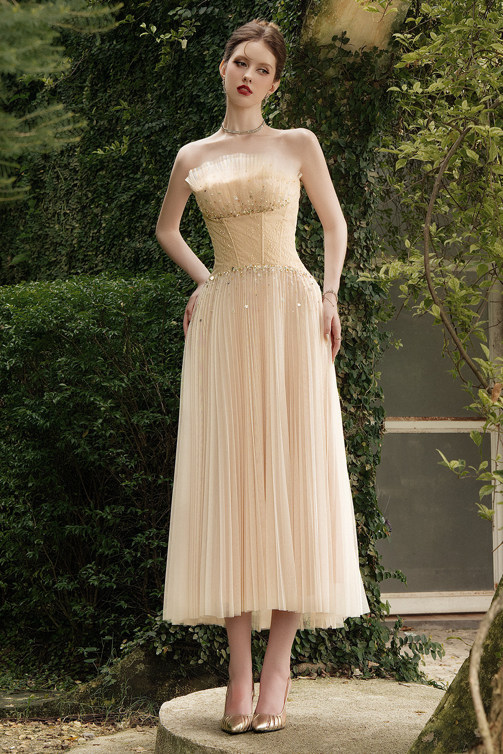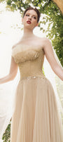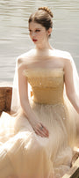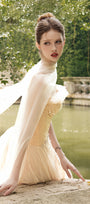 Special Features: Ruffled trim at the neck, Corset waist, Pleated chest and skirt, Asymmetric front and back