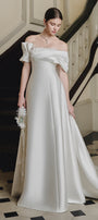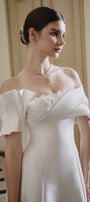 Elevate your wardrobe with this expert-crafted A-line maxi dress featuring an off-shoulder neckline, dramatic puff sleeves, elegant draping, and applique embellishments. Perfect for weddings, galas, and upscale evening events.