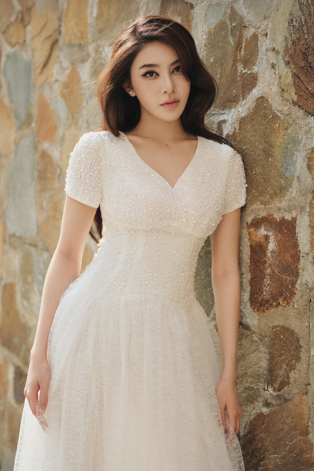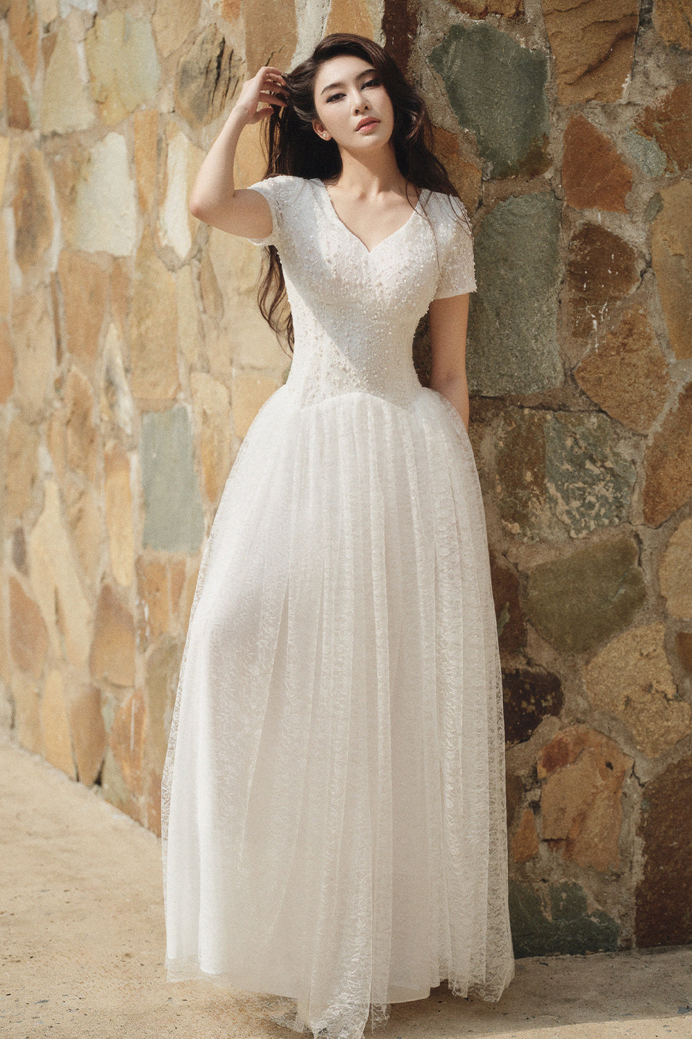Experience refined elegance with this A-line maxi dress, featuring a flattering V-neck, regular sleeves, pleated details, and exquisite bead embellishments. Perfect for formal events, evening gatherings, or weddings where sophistication is key.