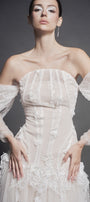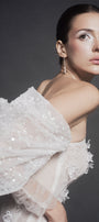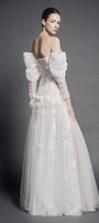 Elevate your elegance with this A-line maxi dress, crafted in exquisite lace with a draped silhouette, puff sleeves, and off-shoulder neckline. Intricate applique adds refined detail. Perfect for weddings, formal events, or sophisticated soirées.