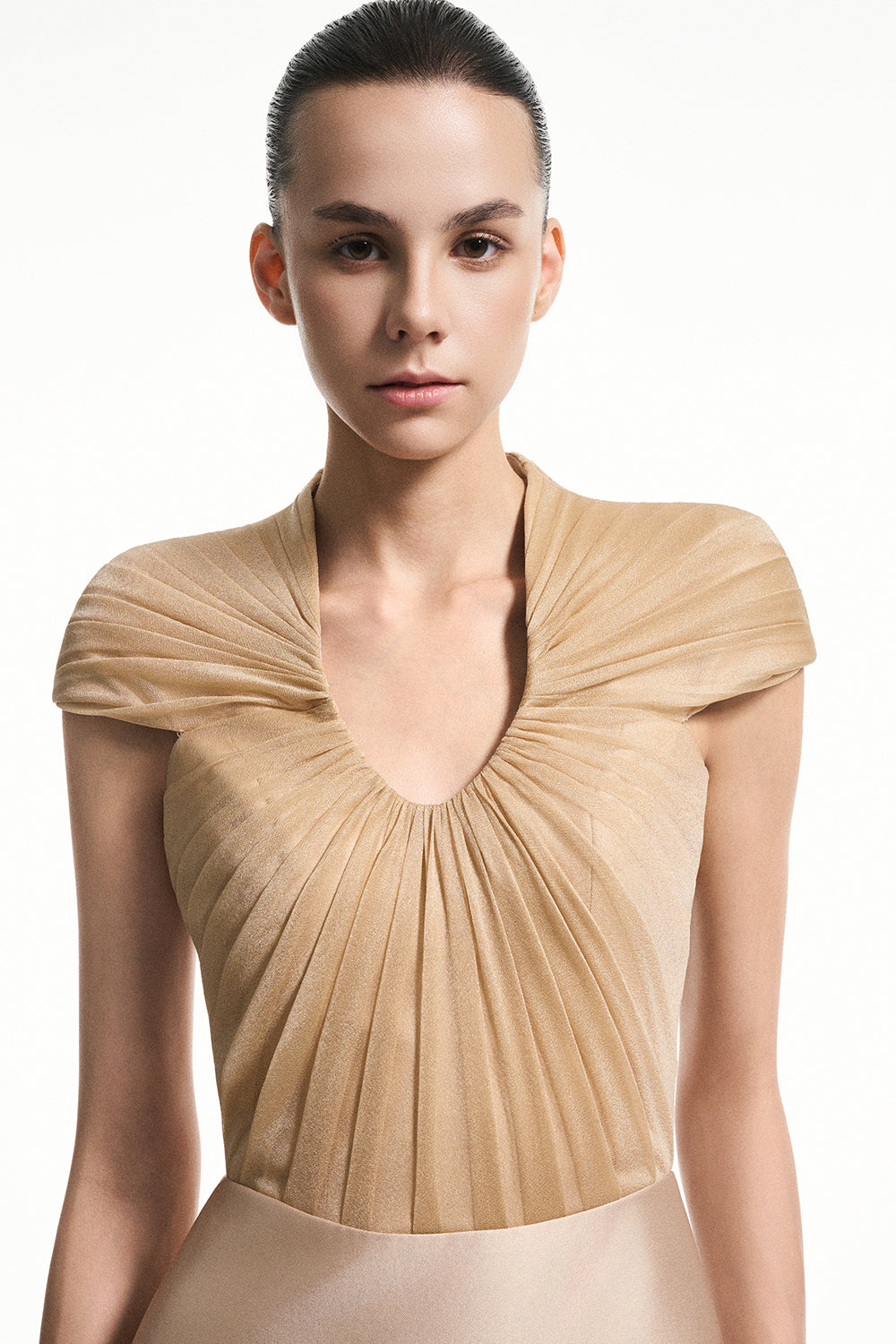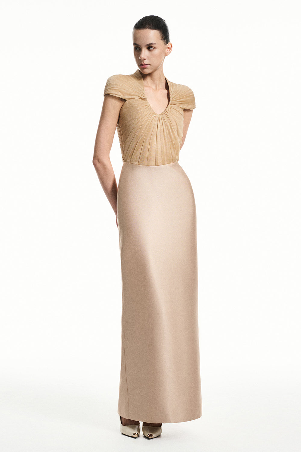 Expertly tailored, this sheath maxi dress features a flattering V-neck, regular sleeves, and elegant pleated details in luxurious spandex. Ideal for cocktail parties, formal gatherings, or evening events.
