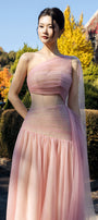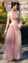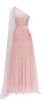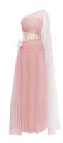 Experience refined elegance in this A-line maxi dress, crafted from delicate tulle with expert gathering and exquisite applique. The asymmetric sleeve and chic one-shoulder neck radiate modern sophistication. Perfect for formal events, weddings, and galas.