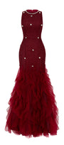 Elevate your elegance with this mermaid silhouette maxi dress in luxe organza, adorned with beads, sequins, and ruffle details. The classic round neck offers timeless charm, ideal for galas, formal events, and evening soirées.