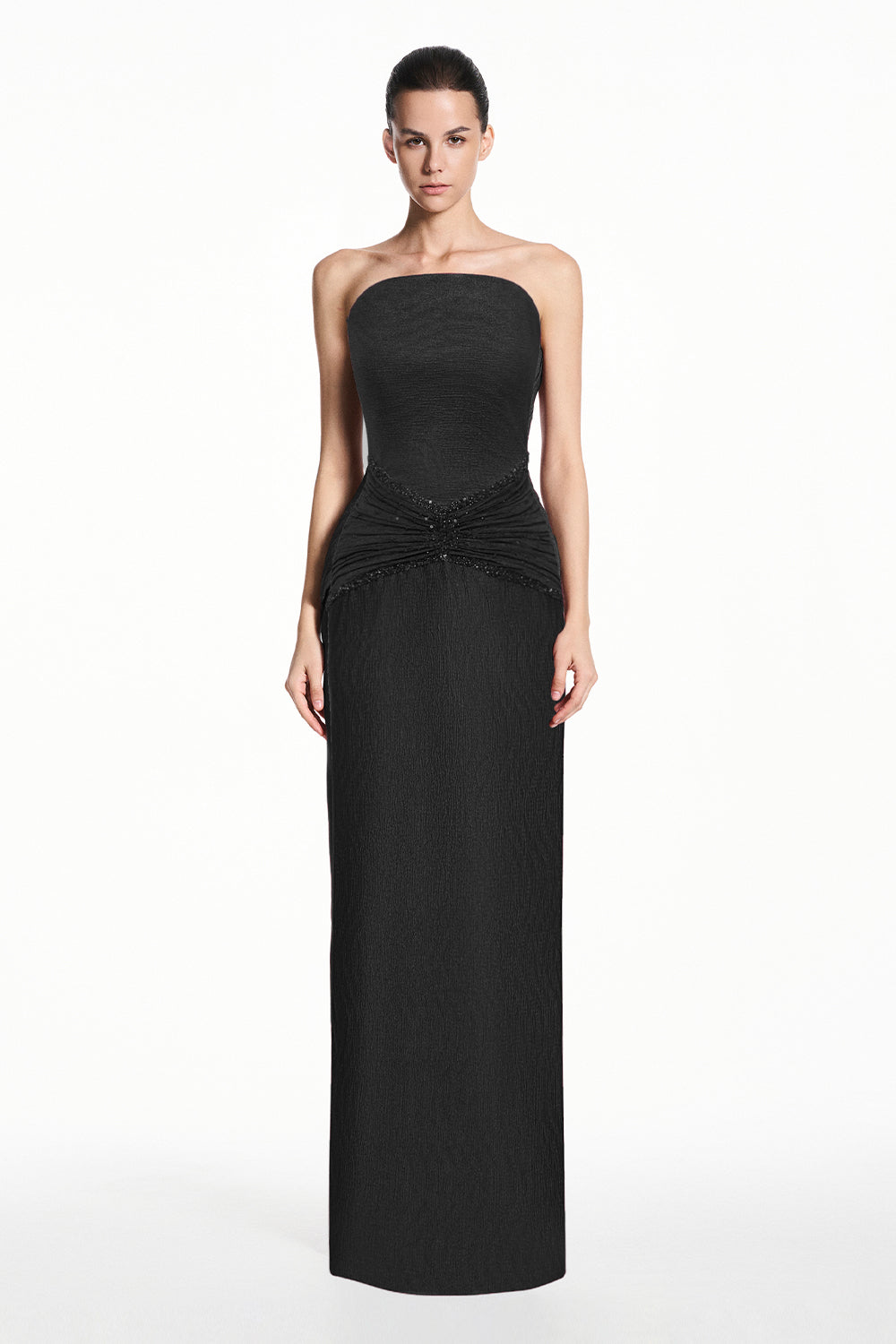 Elevate your evening in this expert-designed sheath maxi dress. Features a straight across neck, elegant draped spandex, and luxe bead and rhinestone embellishments. Perfect for galas, formal events, or upscale parties.