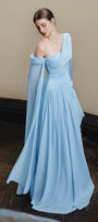 Elevate your wardrobe with this expert-crafted maxi dress, featuring a refined A-line silhouette, asymmetric neck, and elegant cape sleeves. The draped detailing enhances movement and sophistication. Ideal for evening events, weddings, and upscale gatherings.