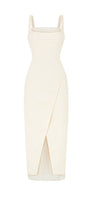 This expertly crafted midi dress features elegant strappy details and a distinctive diagonal flap skirt design. Constructed from lightweight cotton voile, the dresss offers breathable comfort while maintaining a sophisticated silhouette. The strategic diagonal draping creates a flattering asymmetrical look that enhances your natural shape.