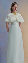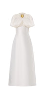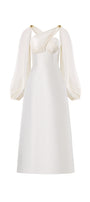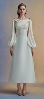 The midi dress features a sophisticated crossover chest design that enhances the neckline with elegant layering. Its distinctive slit puffy sleeves add a modern, airy dimension while maintaining a structured silhouette. Crafted from lustrous taffeta, this midi dress combines classic shape with contemporary details, making it an expert choice for refined occasions.