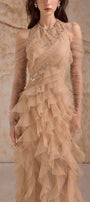 Special Features: Attached rhinestones along neckline, Ruffled layers on the bottom, Gathered sheer sleeves, Open back