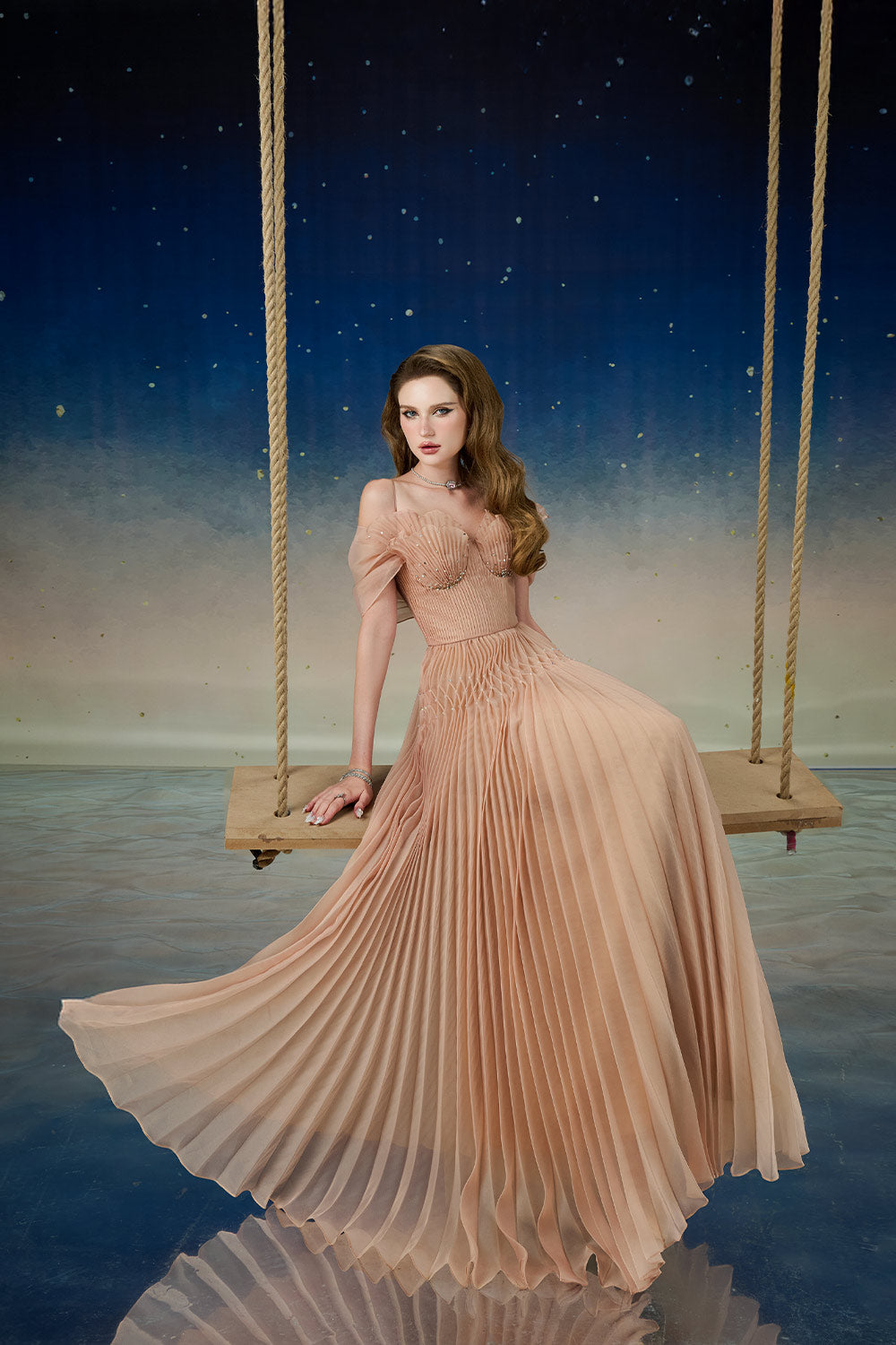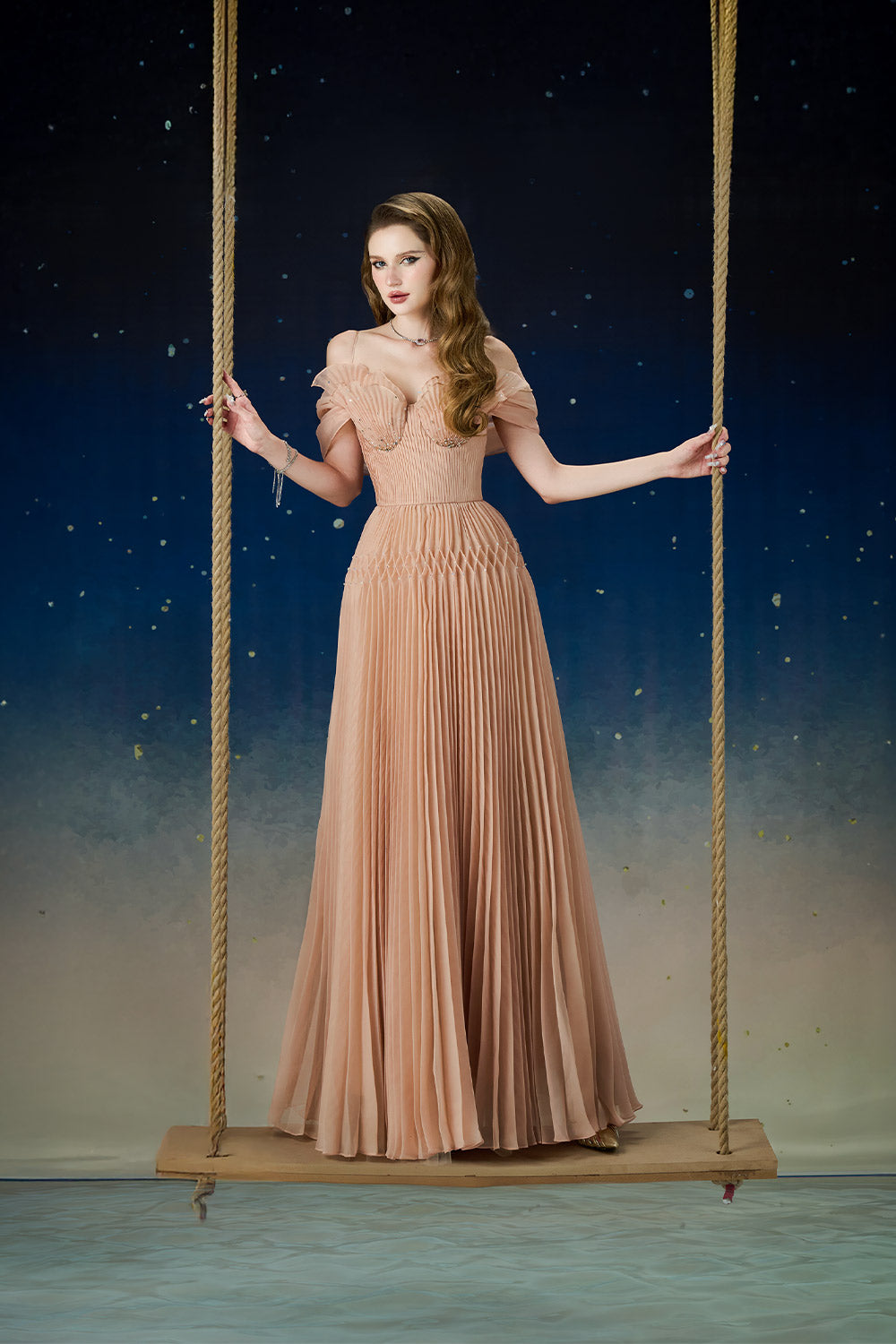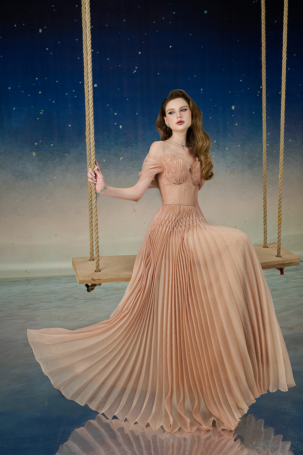 Special Features: Pintucks detail waist and bust with beads, Pleated skirt with rhombus design, Outer chest cup layers create seashell shape, Spaghetti straps with cold shoulder, Seashell chest cup