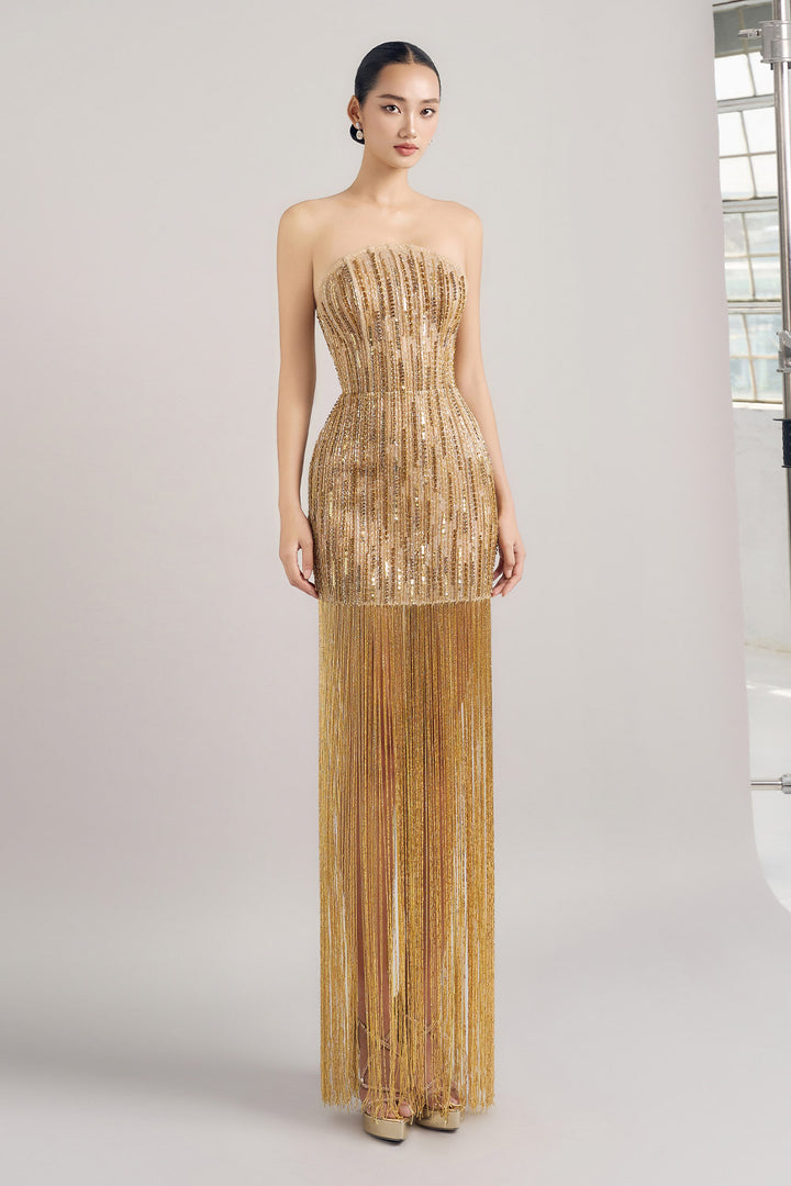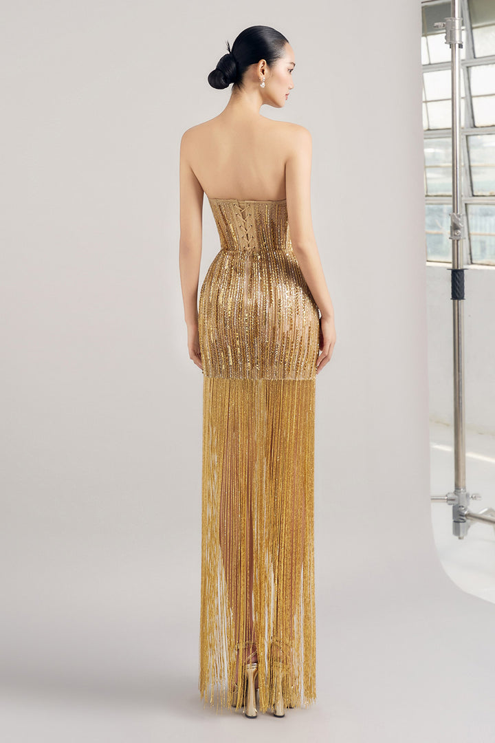 Special Features Open shoulder, Stone tassels on the bottom, Corset lacing at the back, Crystal embossed all over body