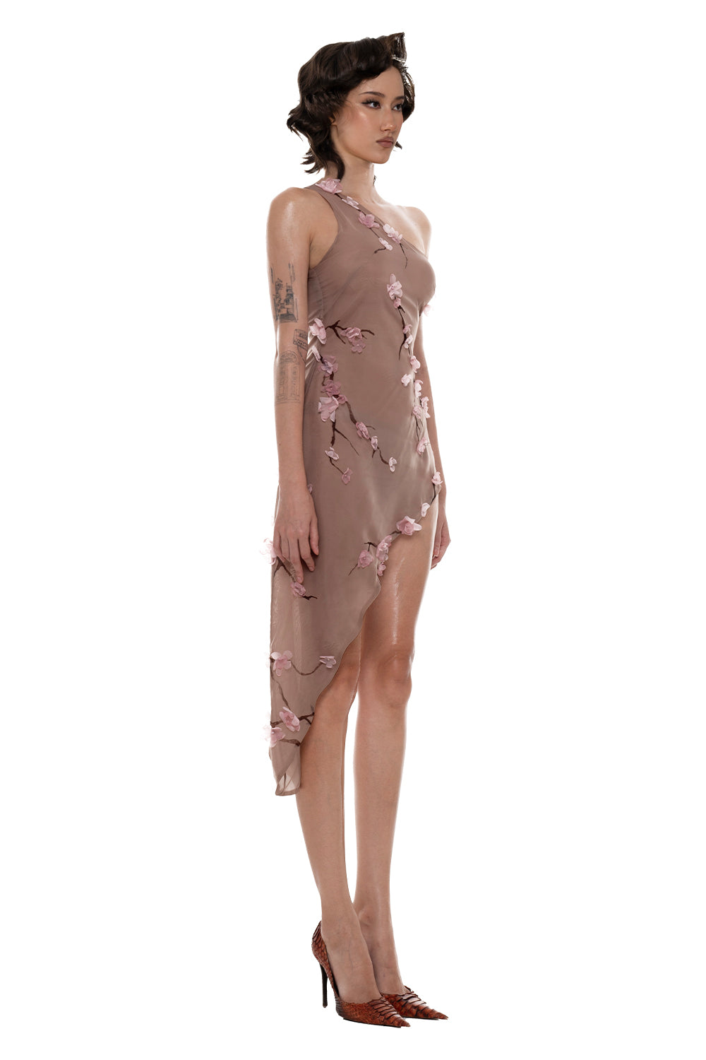 Embrace modern elegance with this asymmetric mini dress featuring a striking one-shoulder neckline and artistic applique embellishments. Expertly tailored, this piece fuses contemporary style and sophistication. Ideal for cocktail parties, evening events, or upscale celebrations.
